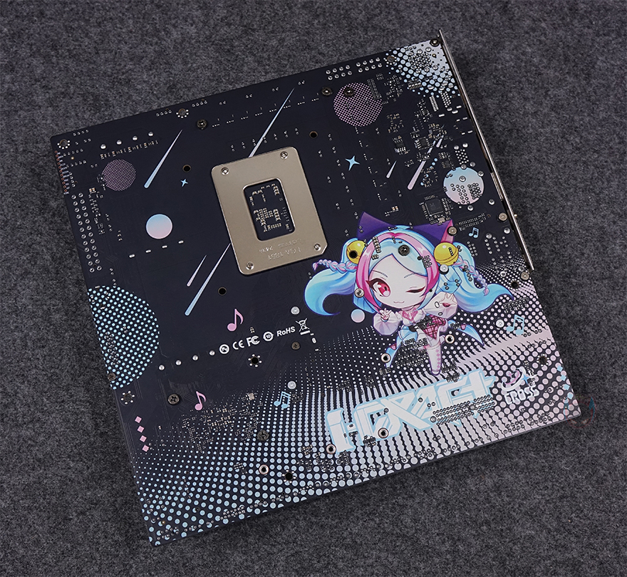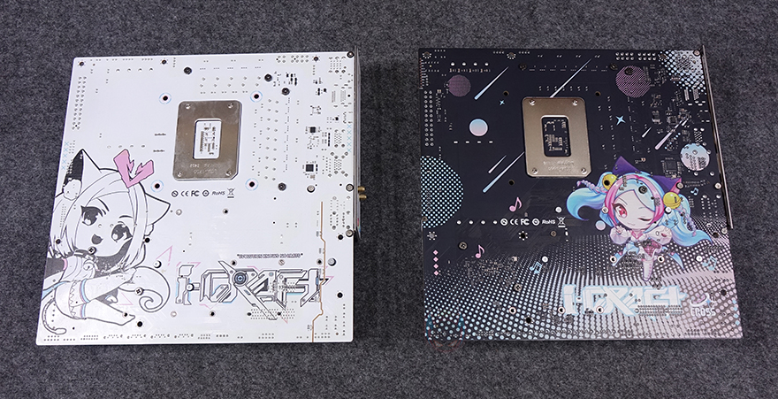 본격적으로 MAXSUN iCraft B860M CROSS PRO 메인보드 레이아웃을 살펴보면, 폼 규격은 M-ATX 타입으로 iCraft CROSS 시리즈는 캐릭터 디자인 콘셉트인 동시에 화이트(White) 콘셉트도 가지고 있죠. 그래서, 이번 모델 역시 이전 모델과 마찬가지로 화이트 PCB를 비롯해 전반적인 화이트 색상을 배경으로 디자인 적용했습니다. 그리고, 이전 세대인 iCraft B760M CROSS와 비교해 보면 일부 디자인 차이가 있다는 것도 알 수 있죠. 또한, 이번 iCraft B860M CROSS는 앞서 언급했듯이 기본 모델과 프로 모델 2가지로 출시되었는데, 기본 모델은 이전 세대와 디자인이 유사합니다. 그리고, 메인보드 후면은 이전 세대에선 화이트 배경이었지만, 이번 모델은 블랙색상 배경에 캐릭터 디자인을 적용했는데, 좀 더 디자인 콘셉트가 돋보입니다.