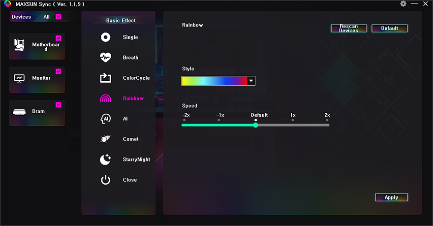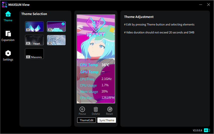 끝으로, iCraft B860M CROSS PRO 메인보드에 사용되는 주요 소프트웨어를 살펴보면, 일단 RGB Sync를 지원하기 때문에 자사 공용 소프트웨어인 MAXSUN Sync 프로그램을 지원합니다. 이미 앞서 자사의 다른 메인보드에서도 다루었기 때문에 기능은 특별히 추가된 것이 없고, 총 8가지 RGB 모드 전환을 할 수 있죠. 그리고, 앞서 언급했던 방열판에 적용된 3.4인치 LCD 디스플레이에 사용할 수 있는 프로그램 역시 자사 플래그십 메인보드에 사용된 MAXSUN View 프로그램이 사용됩니다. 버전업이 되면서 좀 더 안전성을 갖추었고, 앞서 확인한 캐릭터 애니메이션 화면뿐만 아니라 플래그십 메인보드에 사용되었던 화면도 전환해서 사용할 수 있죠. 또한, CPU나 메모리, 저장장치 등의 시스템 모니터링도 가능하고, MP4, JPG, PNG 동영상 및 이미지 파일을 불러와 배경으로도 적용할 수 있습니다. 사이즈는 416x960을 지원하죠. 테마(Theme) 메뉴에선 배경을 바탕으로 시스템 모니터링을 적용할 수 있고, Expansion은 배경만 적용할 수 있습니다. 아직 좀 더 프로그램 완성도를 높여야 하지만, 이전에 만났던 플래그십 메인보드에서 사용했을 때보다 버전업이 되어서 많이 개선되어 잘 작동됩니다.
