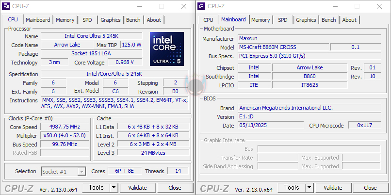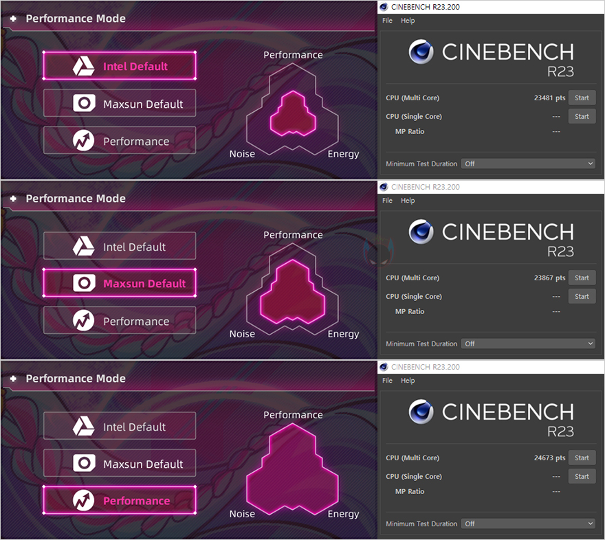 그럼, 이제부터 iCraft B860M CROSS PRO 메인보드에서 지원하는 부품별 하드웨어 성능을 확인해 보면, 먼저 CPU 같은 경우 인텔 코어 울트라 시리즈2 CPU를 지원하기 때문에, 필자는 코어 울트라5 245K CPU를 사용했는데, B860칩셋 기반이기 때문에 CPU 오버클럭은 지원하지 않습니다. CMOS 메뉴에 오버클럭 메뉴가 있어도 사용하는 CPU 최대 허용범위 배수와 전압조절정도만 할 수 있죠. 대신에 Preview 메뉴에서 확인했듯이 3가지 성능모드를 제공하고 있기 때문에 인텔 기본설정값과 MAXSUN 기본설정값, 그리고 Performance 모드로 각각 설정해 Cinebench R23을 실행해 보면, 큰 점수차이는 아니지만 약간의 점수차이가 있음을 확인할 수 있습니다. 사실 최근 CPU들은 기본설정으로 사용해도 부스트클럭이 높게 작동하기 때문에 수동 오버클럭의 매리트는 예전보다 못하죠.