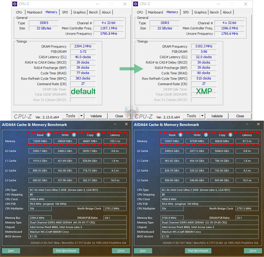 오히려 인텔 B시리즈 메인보드에서 새롭게 주목받는 건 메모리(RAM) 오버클럭입니다. 특히, DDR5 지원부터 높은 클럭 수율을 자랑하는 제품들이 많기 때문에, 인텔 B860칩셋에선 메모리 오버클럭을 지원하죠. 그래서, iCraft B860M CROSS PRO 메인보드에서도 CMOS-Preview 메뉴에서 XMP를 On 설정하거나 Overclock 메뉴에서 Memory Profile에 XMP값을 불러오면 손쉽게 오버클럭으로 적용해 사용할 수 있고, 기본 설정보다 성능 향상 효과를 볼 수 있습니다. 실제 필자가 사용한 메모리는 XMP 6400 MHz 클럭이 적용된 메모리로 기본 설정보다 XMP로 성능향상이 이루어진 것을 확인할 수 있죠. 또한, DDR5 오버클럭 수율에서 많이 사용되는 SK Hynix 칩을 사용했다면, 수동적으로 더 클럭을 올려서 좀 더 성능향상을 기대해 볼 수도 있는데, 필자도 추가로 7600 MHz까지 오버클럭 적용해 좀 더 성능향상을 이루었습니다. 이밖에도 단일 24GB, 48GB 용량의 논-바이너리(Non-binary) 메모리도 완벽히 인식되는 걸 확인할 수 있죠.
