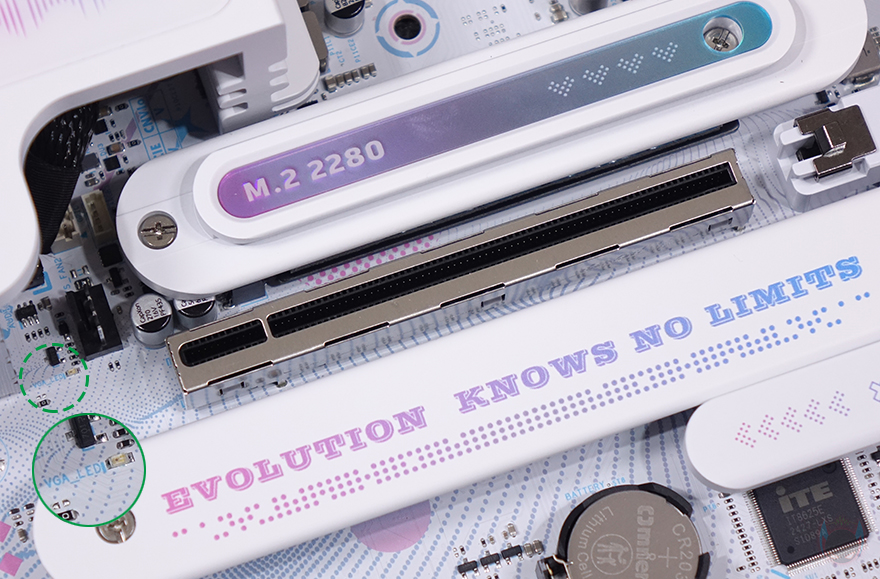 그리고, PCIe 1번 슬롯 위에는 M.2 SSD 슬롯 1번이 배치되어 있는데, 방열판을 분리하면 내부에 SSD 뒷면에도 발열해결을 할 수 있게 써멀패드가 부착되어 있으며, PCIe 5.0x4 규격으로 2242/2280 시리즈를 장착할 수 있고, 분리된 방열판 안쪽에도 기본 써멀패드가 부착되어 있습니다. 또한, PCIe 1번 슬롯 아래에 추가로 배치된 M.2 SSD 슬롯 2번 역시 방열판이 장착되어 있으며, 분리하면 2242/2280/22110 사이즈까지 장착할 수 있게 나사홀이 적용된 것을 확인할 수 있고, 역시 분리된 방열판 안쪽에는 써멀패드가 부착되어 있습니다. 또한, 대각선 오른쪽 방향 아래 즉 메인 B860칩셋이 위치한 방열판 아래쪽에도 추가 M.2 SSD 3번이 오픈형으로 배치되어 있는데, 역시 2242/2280/22110 사이즈까지 장착할 수 있고, 2, 3번 슬롯은 모두 PCIe 4.0x4 규격을 지원합니다. 또한, 슬롯 위치에서 메인보드 맨 오른쪽에는 온보드 전원 버튼 배치와 부팅 상태를 확인할 수 있는 LED도 적용되어 있는 걸 확인할 수 있죠.