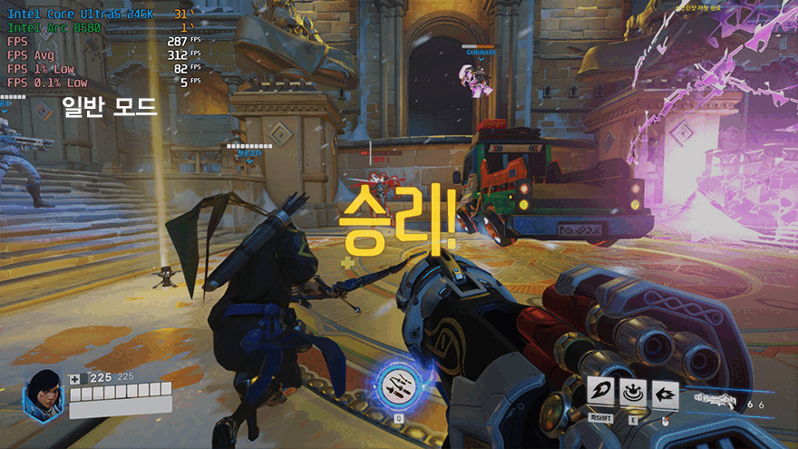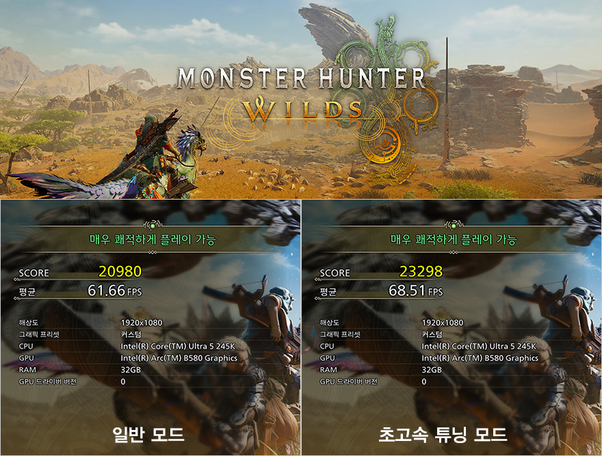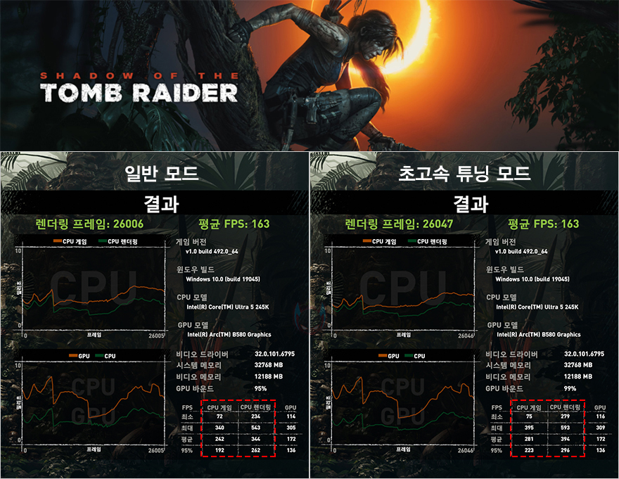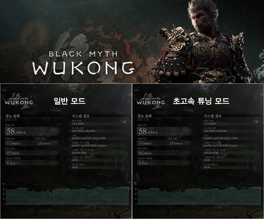 이번에는 게임에서 성능을 확인해 보는데, 애프터버너 프로그램을 사용해 프레임 수치를 통한 일반 모드일 때와 초고속 튜닝 모드일 때를 비교해 보면, 국민게임이라 할 수 있는 배틀그라운드나 오버워치 2 같은 FPS 게임에선 실시간 프레임이나 평균 프레임은 변동폭이 크기 때문에 모드와 큰 연관이 없지만, 변동폭이 대체로 적은 1% 프레임이나 0.1% 프레임에서는 초고속 튜닝 모드로 플레이했을 때 좀 더 높아진 효과를 확인할 수 있습니다. 게임 내 동일한 플레이 영상으로 벤치마크를 할 수 있는 즉 벤치마크 툴을 담고 있는 다이렉트X 12 게임들 위주로 좀 더 테스트를 해보면, 프레임뿐만 아니라 점수결괏값으로도 초고속 튜닝 모드에서 좀 더 나은 결과를 얻는 걸 확인할 수 있죠. 물론, 지난 시간에서 언급했듯이 성능모드라고 해서 기본설정보다 성능이 많이 향상되는 건 아니기 때문에 일부 게임에선 큰 차이를 보이지 않는 경우도 있습니다.