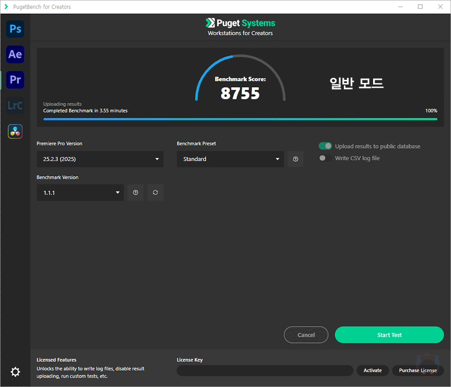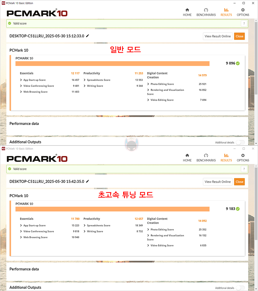 끝으로, 작업 성능으로 일반적으로 많이 사용하는 사진 편집과 동영상 편집 및 효과에 어도브 포토샵, 애프터 이펙트, 프리미어 프로 프로그램을 동일한 조건 작업에서 벤치마크할 수 있는 PugetBench를 통해 실행해 봤습니다. 작업 성능에서도 역시 일반모드보다 초고속 튜닝 모드를 사용했을 때 높은 점수를 얻는 것을 확인할 수 있어서, 게임과 작업용 모두 만족스럽게 코어 울트라5 시리즈2 245K CPU를 사용하고 싶다면, 바이오스 CMOS에서 초고속 튜닝 모드로 선택할 것을 권장합니다. 이것으로 성능편을 마치고, 다음 시간에는 3부작 마지막 시간으로 코어 울트라 시리즈2 CPU 오버클럭에 대해서 알아보겠습니다.