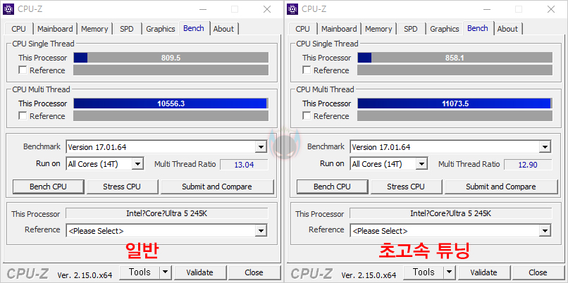 성능 비교는 최근 CPU 지원 메인보드에서 소비자들의 바이오스 CMOS 접근이 쉬워지면서 손쉽게 성능향상을 할 수 있는 모드 설정을 지원해주고 있습니다. 지난 시간 CPU와 함께 다룬 ASUS Z890 AYW GAMING WIFI W 메인보드 역시 바이오스 CMOS 화면으로 들어가면, 메인화면에서 기본설정의 일반 모드와 고속 튜닝/초고속 튜닝 2가지 성능 모드 메뉴를 갖추고 있죠. 그래서, 기본 설정의 일반모드와 안정적으로 최대한 성능을 끌어내는 초고속 튜닝 모드에서 각각 벤치마크, 게임, 작업 성능을 확인해 보겠습니다. 먼저, 일반적으로 많이 사용하는 시스템 벤치마크 프로그램으로 성능 확인을 해보는데, CPU-Z에서 CPU 점수벤치를 실행해 보면, 일반 모드보다 초고속 튜닝 모드로 설정했을 때 좀 더 높은 점수가 나오는 것을 확인할 수 있으며, 전체 시스템 벤치마크로 많이 사용하는 PCMark10에서도 역시 초고속 튜닝 모드설정에서 좀 더 높은 점수 결괏값을 얻을 수 있고, 3DMark 유료 버전에서 사용할 수 있는 CPU 벤치마크에서도 초고속 튜닝 모드가 더 높은 점수를 얻는걸 확인할 수 있습니다.