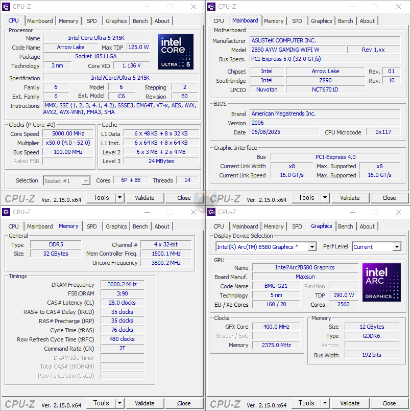 최근 인텔이 최신 데스크탑 프로세서 '코어 울트라 시리즈2' CPU에 대한 대규모 체험단 행사를 진행하면서 지난 시간부터 코어 울트라 시리즈2 CPU에 대해 다루고 있습니다. 지난 시간에 CPU에 대한 소개와 이를 뒷받침해주는 Z890 메인보드에 대한 CPU 최적화 세팅을 위한 바이오스 업데이트와 실사용 전 CPU 안정화까지 확인해 보는 시간을 가졌죠. 이번 시간부터는 본격적으로 코어 울트라 시리즈2 CPU에 대한 성능을 확인해 보는데, 필자는 코어 울트라5 시리즈2 245K CPU를 사용하기 때문에, 코어 울트라 시리즈2 CPU 라인업 위치상 소비자가 가장 대중적으로 선택할 수 있는 메인스트림급 시스템에 적합합니다. 그래서, 실제 테스트를 위한 시스템 역시 그래픽카드는 인텔 메인스트림급으로 인정받고 있는 아크(Arc) B580 그래픽카드를 선택했으며, 메모리 역시 인텔하면 작업용으로 여전히 많이 추천받기 때문에 DDR5에서 램 타이밍이 가장 빠른 CL28 제품을 사용했습니다. 그럼, 본격적으로 코어 울트라 시리즈2 CPU의 성능을 확인해 보죠.
