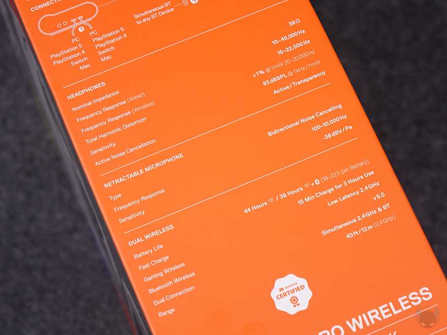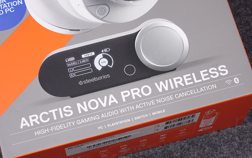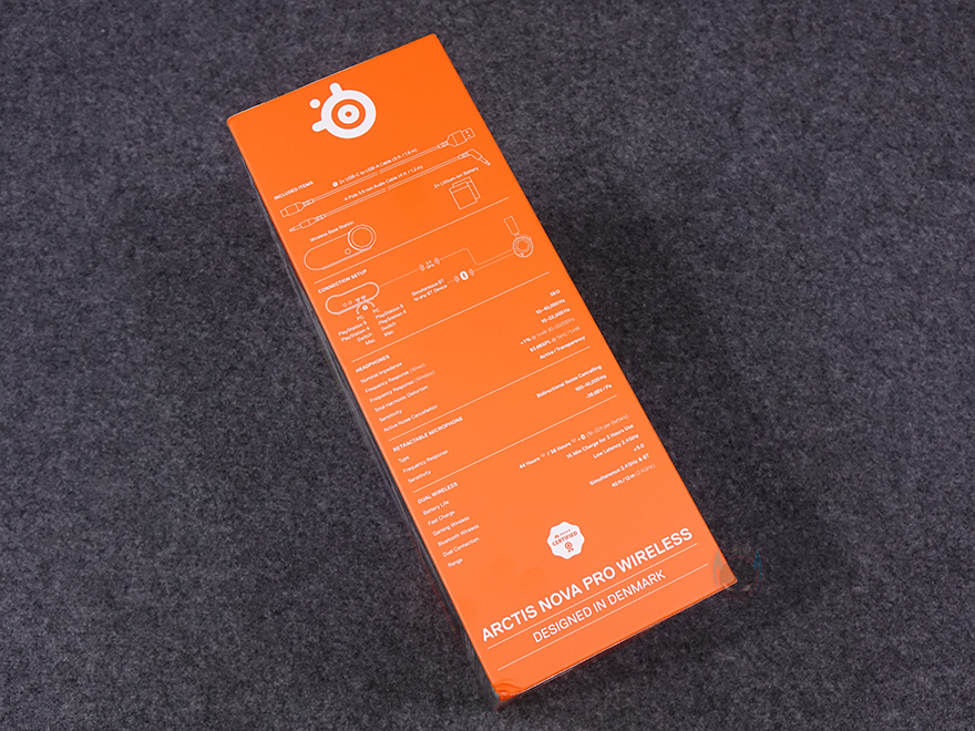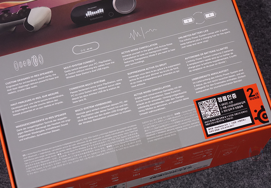제품 패키지인 박스부터 살펴보면, 전면에는 제품 이미지 일부와 뒤에서 확인하겠지만, 제품 주요 특징 중 하나인 베이스 스테이션 이미지를 담으면서 해외 미디어 최고 평점, 무한 배터리 수명, 그리고, PC 및 플레이스테이션 호환 표기를 확인할 수 있습니다. 참고로, 아크티스 노바 프로 무선은 플레이스테이션과 XBOX 지원에 따라 2가지 모델로 구분되죠. 그리고, 모델명 아래에는 액티브 노이즈 캔슬링 표기도 해놨기때문에 지원한다라는 걸 미리 알 수 있습니다. 박스 한쪽 측면에는 방금 언급한 해외 미디어 최고 평점 외에 다른 미디어에서도 높은 평가를 받은 부분을 부각하면서 제품의 위상을 알려주고 있으며, 반대쪽 측면에는 아크티스 노바 프로 무선 헤드셋을 제외한 나머지 구성품 표기와 멀티 시스템 커넥터 역할의 베이스 스테이션 연결법, 그리고, 제품의 기본 사양 표기를 확인할 수 있습니다. 박스 후면에는 연출 이미지와 함께 아래에 제품의 주요 특징을 다국적 언어로 표기해 놨는데, 한국어는 포함되어 있지 않습니다.