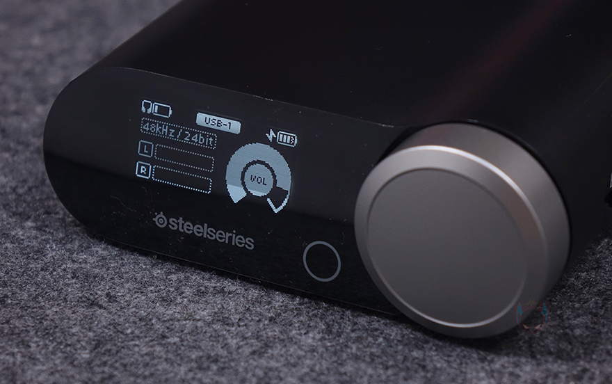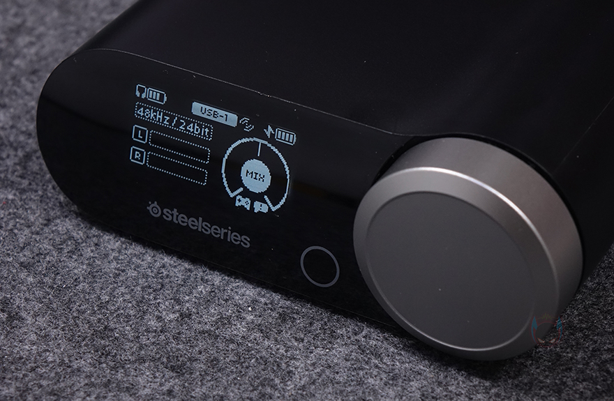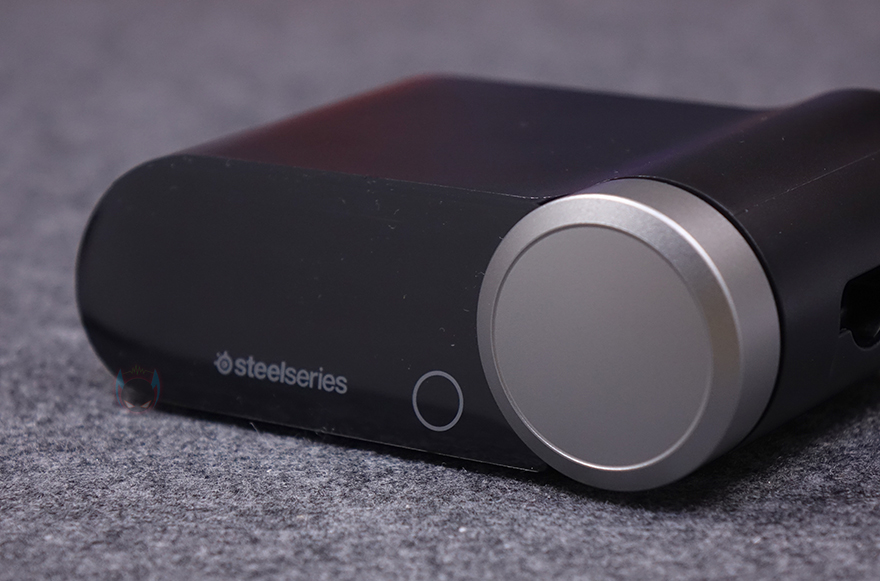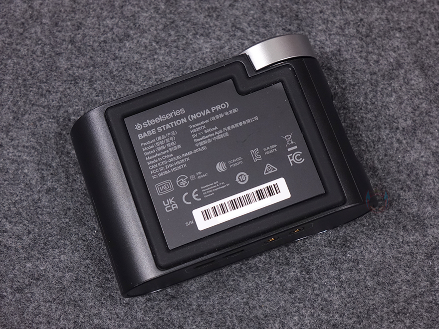 그리고, 아크티스 노바 프로 무선(ARCTIS NOVA PRO WL) 헤드셋의 주요 특징 중 하나는 별도의 커넥터 장치 '베이스 스테이션'이 사용된다는 점인데, PC 및 콘솔 등의 장치 연결부터 아크티스 노바 프로 무선(ARCTIS NOVA PRO WL) 헤드셋 연결, 그리고, 다양한 기능 등 컨트롤 할 수 있는 멀티 시스템 커넥터인 동시에 무선 2.4G 수신기 역할도 합니다. 뒤에서 확인하겠지만, 전원이 들어오면 전면에 OLED 디스플레이와 함께 오른쪽 배치된 다이얼 버튼을 통해 볼륨 조절부터 다양한 옵션 기능을 다룰 수 있죠. 또한, 오른쪽 측면에는 헤드셋 교체용 배터리는 충전할 수 있는 수납공간이 있어서, 상시 충전시켜 둔 상태로 유지해 언제든지 교체하면서 무한 배터리 사용으로 헤드셋 무선사용 유지를 할 수 있죠. 베이스 스테이션 후면에는 외부 장치 및 전원과 연결되는 USB 타입 C 포트 2개와 외부 스피커와 연결할 수 있는 라인 인/아웃 3.5mm 포트가 배치되어 있으며, 밑바닥 부분에는 미끄럼방지를 위해 패드가 부착되어 있습니다.
