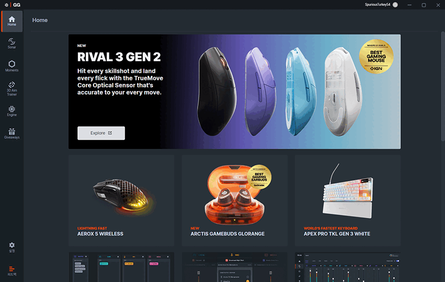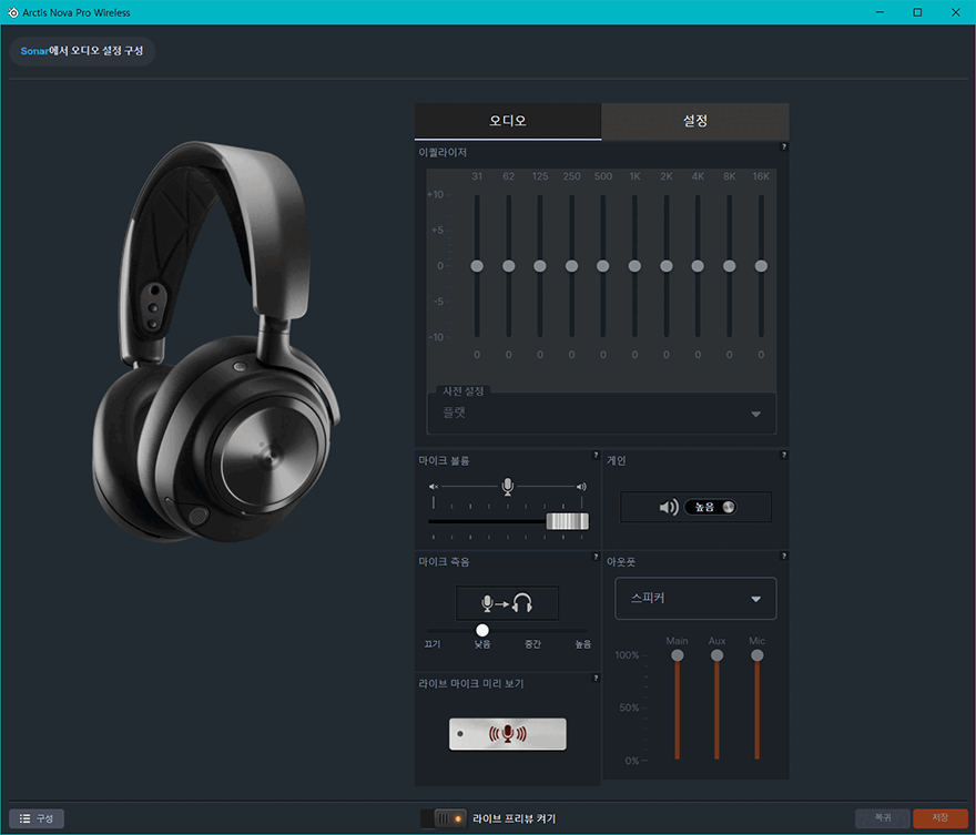 또한, PC에서 사용할 때는 스틸시리즈 공용 소프트웨어인 SONAR 프로그램을 사용할 수 있는데 계정을 생성하면, 믹서 음향 기능인 Sonar를 비롯해 캡처/녹화 기능 Moments, FPS게임에서 중요한 에임 향상을 위한 3D Aim 트레이너, 장치설정을 다룰 수 있으며, 이벤트 소식도 확인할 수 있다. 특히, 장치 설정으로 들어가면, 방금 베이스 스테이션에서 확인했던 시스템 설정 메뉴들을 대부분 소프트웨어에서도 다룰 수 있게 메뉴를 구성하고 있죠. 참고로, 프로그램에서 Sonar 기능이 활성화되면 베이스 스테이션과 장치 설정의 이퀄라이저를 다룰 수 없기 때문에, 만약 베이스 스테이션이나 프로그램-장치설정에서 이퀄라이저를 다루길 원한다면 Sonar 기능을 비활성화시켜야 합니다. 또한, SONAR 프로그램을 사용하게 되면, 베이스 스테이션에서 추가로 게임과 채팅 사운드를 조절할 수 있는 Chatmix 기능을 사용할 수 있습니다.