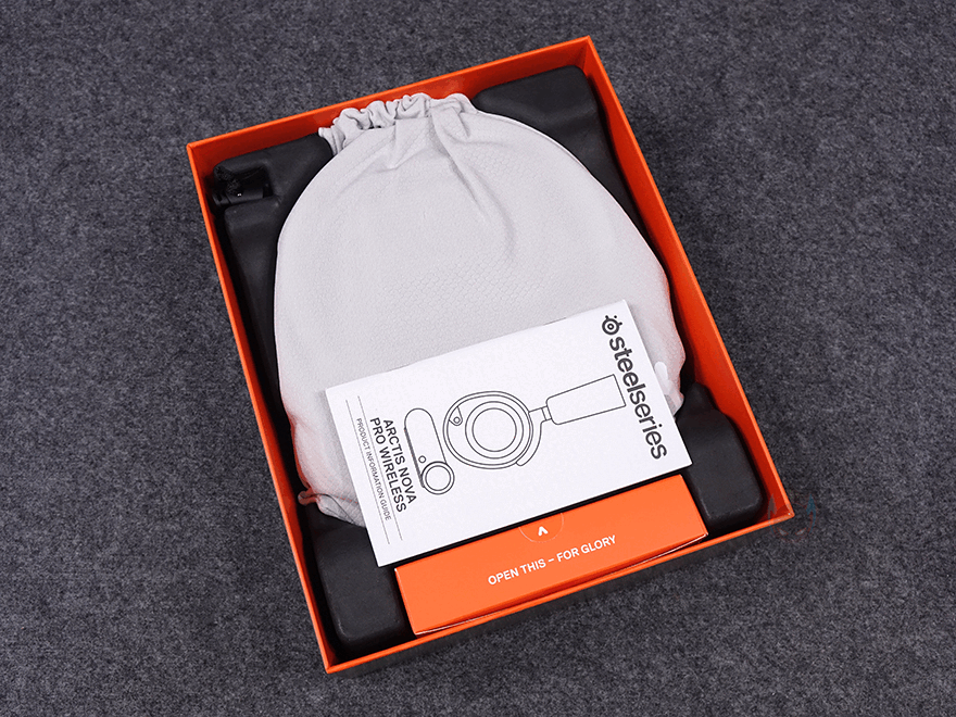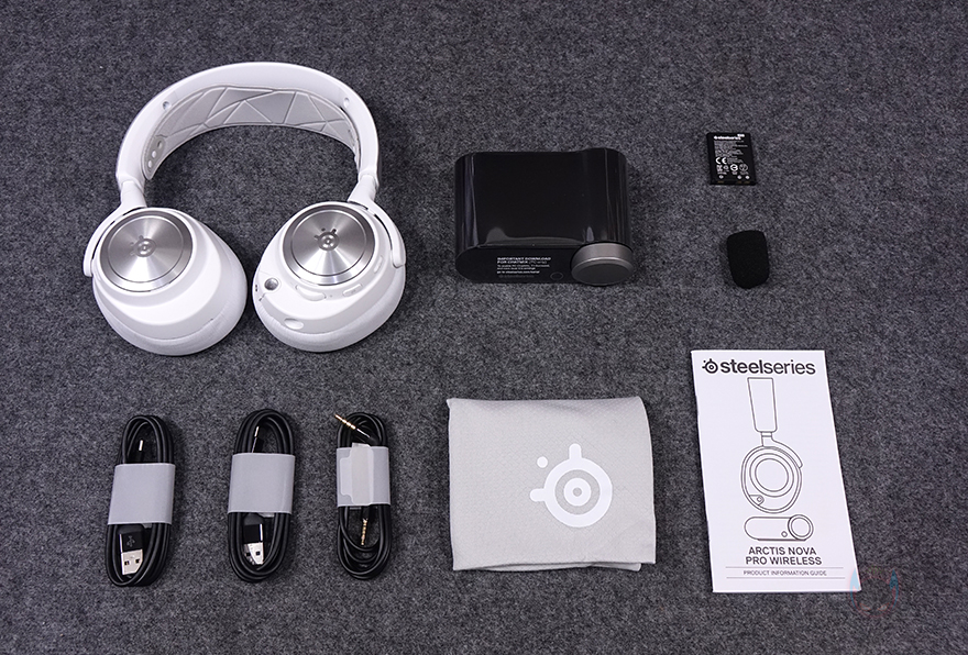 박스 위아래 각각 부착된 동봉씰을 제거해서 박스를 열어보면, 전용 파우치에 보관된 아크티스 노바 프로 무선 헤드셋을 확인할 수 있고, 파우치 아래에는 베이스 스테이션, 그리고 나머지 구성품들은 별도의 박스 포장에 담겨져 있습니다. 제품 전체 구성으로는 아크티스 노바 프로 무선 헤드셋, 베이스 스테이션, 여분의 충전배터리, 마이크 팝 필터, USB 케이블 2개, 오디오 케이블 1개, 전용 보관용 파우치, 제품 설명서로 이루어져 있죠. 제품 설명서에는 한국어가 포함되어 있습니다.