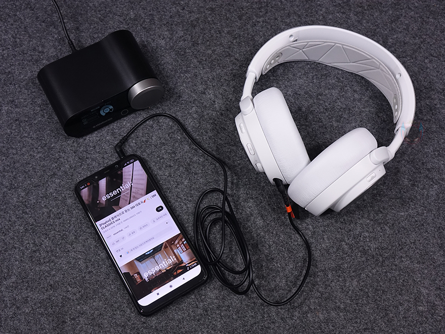 그리고, 스마트폰이나 태블릿PC를 사용할 경우에는 블루투스 방식으로 연결해 사용할 수 있으며, 만약 지연시간 없이 사운드를 즐기고 싶다면, 제공되는 3.5mm 4극 오디오 케이블을 사용해 유선으로 사용하면 됩니다. 단, 유선 사용 시에는 블루투스와 베이스 스테이션과 연결된 무선 2.4G도 자동 Off 되며, 오디오 케이블을 분리하면 다시 자동으로 연결됩니다. 또한, 모바일기기에서 블루투스 사용 시 헤드셋 이어-컵의 볼륨조절을 사용하려면 베이스 스테이션과 연결된 무선 2.4G 전원을 Off 해야 되고, 유선 사용 시에는 헤드셋 볼륨조절 기능을 사용할 수 없고, 모바일기기에서 볼륨조절을 해야 합니다.