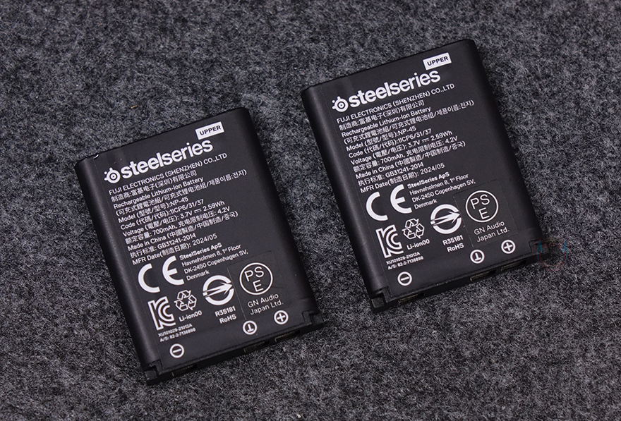 이어-컵(Ear-Cup) 같은경우에는 바깥쪽에 스틸시리즈 로고가 새겨진 스틸 플레이트를 확인할 수 있는데, 양쪽 모두 자석방식으로 분리가 가능하고, 오른쪽 이어-컵 같은 경우에는 플레이트를 분리했을 때 배터리가 수납된 걸 확인할 수 있습니다. 헤드셋에 기본 장착된 배터리와 앞서 구성품에서 확인한 여분의 배터리 총 2개의 배터리를 통해 번갈아 사용하면 배터리 잔량 걱정은 할 필요가 없죠. 또한, 배터리 타입도 흔히 많이 사용되는 NP-45 타입이라 유지보수에도 용이합니다. 물론, 배터리 종류는 충전식이기 때문에 리튬 이온입니다. 그리고, 오른쪽 이어-컵 측면에는 모바일기기와 연결할 수 있게 블루투스 버튼과 연결 상태를 확인할 수 있는 LED 인디케이터가 배치되어 있습니다. 또한, 아크티스 노바 프로 무선(ARCTIS NOVA PRO WL) 헤드셋은 주변 소음을 감지해 감소해 주는 액티브 노이즈 캔슬링을 갖추고 있기 때문에 이를 감지하는 벤트홀도 양쪽 측면 윗부분에 적용되어 있죠.