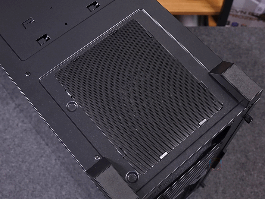 케이스 상단 역시 전면과 마찬가지로 상단 쿨링 효과를 볼 수 있도록 메쉬 디자인 패널을 적용했는데, 후면에 고정 손나사를 풀면 쉽게 분리가 되고, 전면과 상단 메쉬 구멍 모두 촘촘하기때문에 별도의 먼지필터는 적용되어 있지 않습니다. 그리고, 패널을 분리하면 상단에도 쿨링시스템을 갖출 수 있게 나사홀이 적용되어 있으며, 팬 장착 시 140mm 경우 최대 2개, 120mm 경우 최대 3개를 장착할 수 있고, 수랭쿨러시 라디에이터는 최대 360mm를 장착할 수 있죠. 그리고, 상단 맨 오른쪽 앞부분에는 버튼 및 포트가 배치되어 있는데, 맨 앞쪽에 전원버튼을 비롯해 뒤로 리셋 버튼, USB 2.0 포트, 마이크&헤드셋 포트, USB 3.0 포트, USB 타입 C포트, LED 버튼순으로 나열되어 있습니다. 특히, USB 타입 C포트는 USB 3.2 Gen2x2 규격까지 지원해 최대 20 Gbps 속도를 자랑합니다.