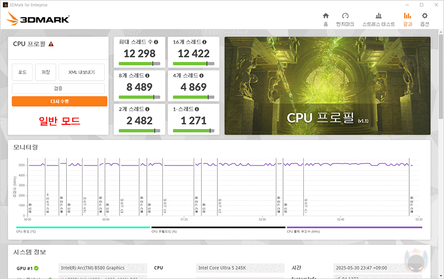 안정화까지 확인한 수동 오버클럭 설정으로 기본 설정의 일반 모드와 초고속 튜닝 모드 3가지 설정 모드로 각각 성능 확인을 해봤습니다. 일단, CPU 위주로 CPU-Z와 3DMark 유료버전에서 사용할 수 있는 CPU 프로필 벤치마크를 실행해 본 결과, 수동오버클럭이 가장 높은 점수를 가지는걸 확인할 수 있으며, 일반 모드와는 꽤 차이를 보이는 반면, 초고속 튜닝 모드와는 약간 차이를 보이는 수준입니다.