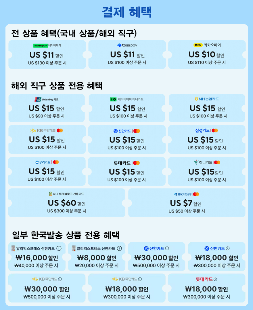 여름 시작과 함께하는 6월 프로모션 '쿨하게 JUNE비해 ' 행사는 규모가 큰만큼 오랜만에 할인코드와 결제할인이 풍부하게 제공되는데, 먼저 결제할인 같은경우에는 3월 창립기념일이나 11월 광군제와 비슷하게 대부분의 카드할인과 페이할인이 적용된다. 일단, 네이버/토스/카카오페이는 해외직구, 국내발송 상품 모두 적용되며, 해외직구 상품에만 적용되는 카드할인에는 유니페이, 네이버페이머니카드, 농협/KB/신한/삼성/우리/롯데/하나/IBK카드가 적용되며, 가장 큰 할인을 해주는 카드는 하나 트래블로그이다. 카드 대부분은 100달러이상 구매시 15달러이다. 이 밖에 국내발송 그러니깐 한국발송 상품 일부에도 적용되는 할인카드들이 있는데, 이때는 한국발송 전용 카테고리(바로가기)에서 구매해야한다.