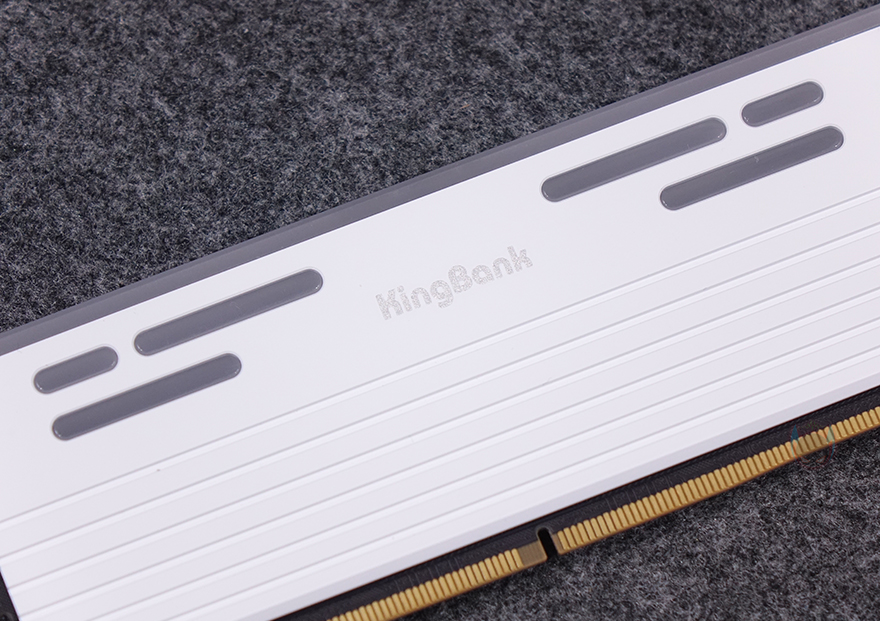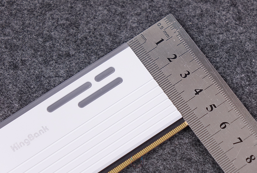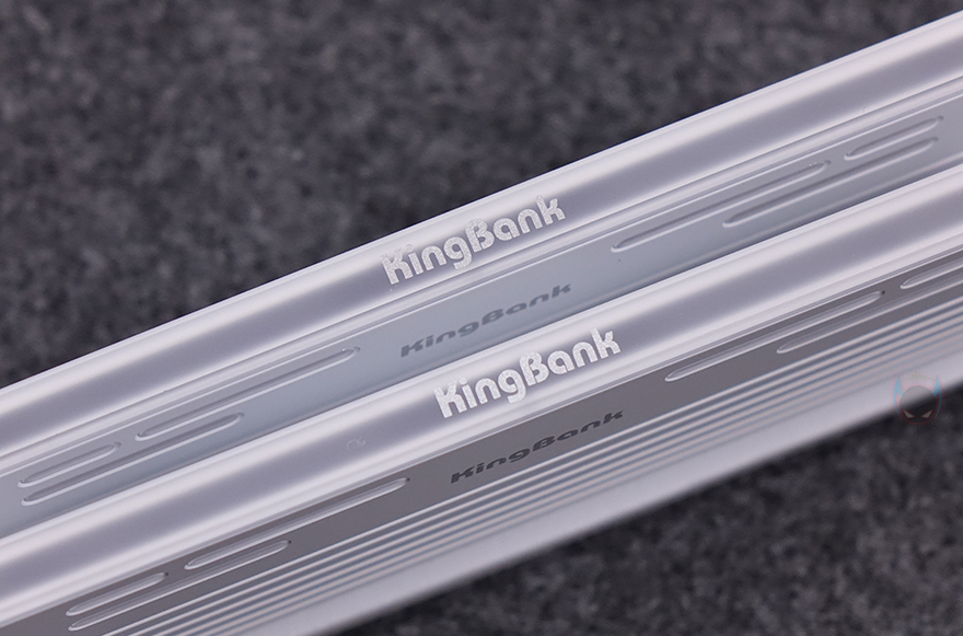 좀 더 자세히 살펴보면, 방열판 중간에는 KingBank 로고를 새겨놨으며, 로고 기준으로 양쪽으로는 측면에도 일부 RGB 라이트닝 효과를 볼 수 있게 디자인이 적용되었고, 로고 아래로는 줄무늬 디자인이 적용되어 있습니다. 그리고, 반대편 방열판에는 앞서 제품 박스에서 노출되었던 해당 제품의 스펙을 표기한 스티커가 부착되어 있죠. 참고로, 양쪽 방열판 디자인이 똑같은 거 같지만, 한쪽 방열판에는 양쪽으로 삼각형 디자인이 추가로 적용되어 있습니다. 그리고, 방열판 상단에는 RGB 라이트닝 효과를 볼 수 있는 LED 바(Bar)가 적용되어 있으며, 중간에 역시 KingBank 로고를 새겨놨습니다. 측면에서 보면 메모리 PCB기반 맨 위에서부터 아크릴이 적용된 걸 확인할 수 있죠.
