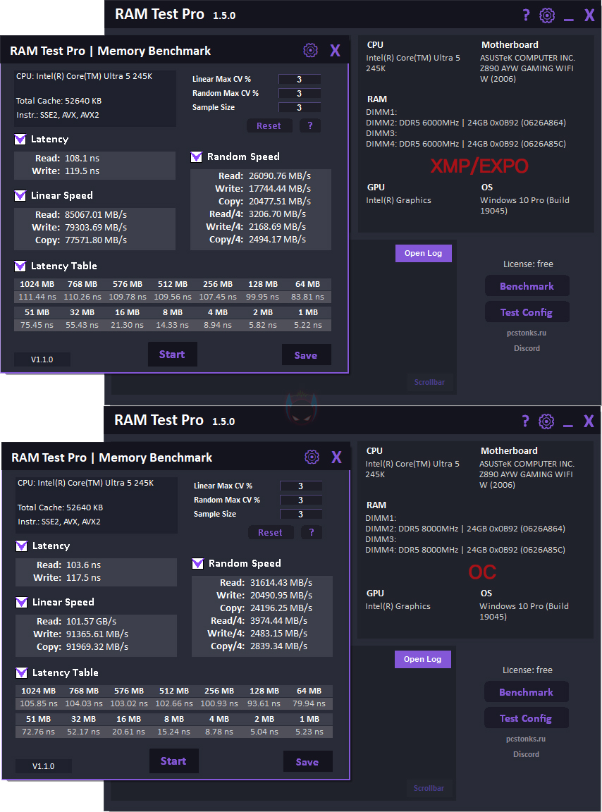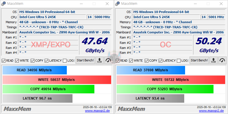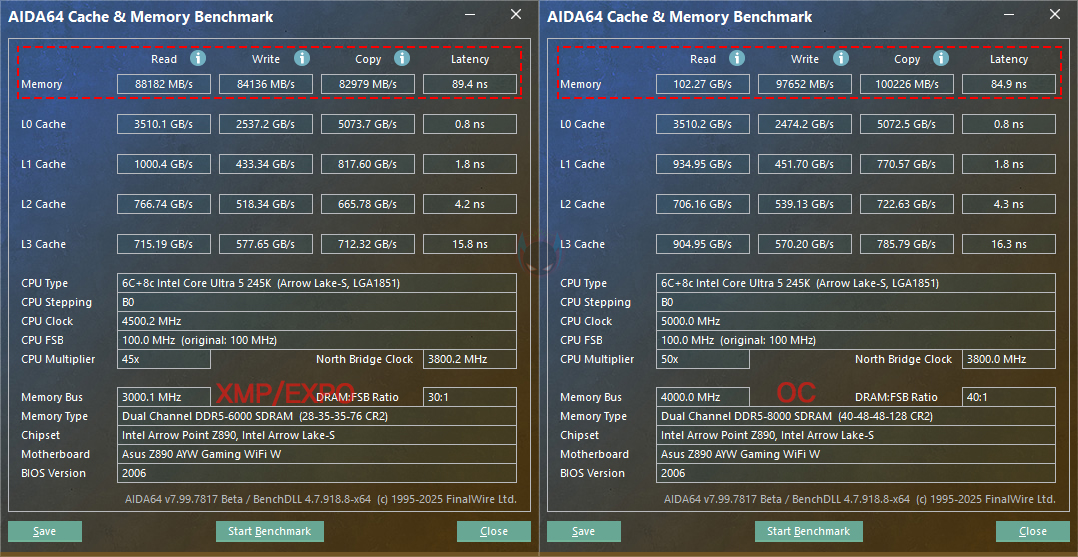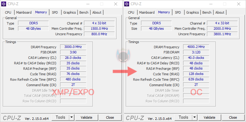 끝으로, DDR5-6000 48GB(24GBx2) 메모리의 XMP/EXPO 프로파일 설정값 같은경우 1.45V 전압에서 설정되어 있는데, 사실 이번 새로운 디자인의 메모리는 DDR5-6000뿐만 아니라 DDR5-8000 그러니깐 XMP/EXPO 프로파일이 8000MHz으로 적요된 모델도 함께 출시했습니다. 그래서, 두 모델이 동일한 SK 하이닉스 M 다이(Die) 칩이 사용된 제품인만큼 전압은 그대로 두고, 타이밍값과 클럭값을 조정해서 수동적으로 추가 오버클럭을 해봤습니다. 확인결과, DDR5-8000 모델과 유사한 설정값으로 손쉽게 오버클럭이 되는걸 확인할 수 있었고, 8000MHz으로 오버클럭한 상태에서 앞서 확인한 XMP/EXPO 성능과 비교를 해보면, 좀 더 나은 성능을 보여주는걸 확인할 수 있었습니다. 그래서, 오버클럭을 할 줄 아는 소비자라면, DDR5-6000 48GB(24GBx2) 메모리를 수동 오버클럭으로 사용해 보는 것도 매리트가 있다 할 수 있겠습니다.
