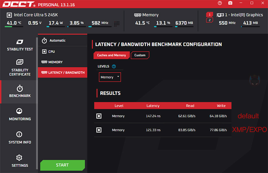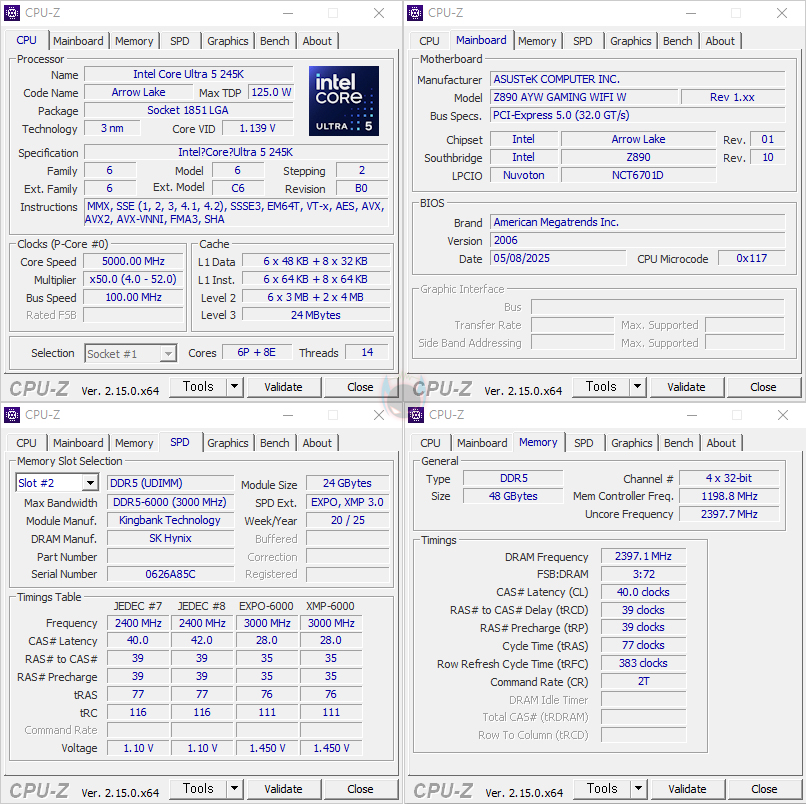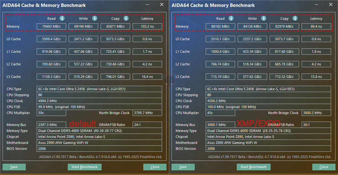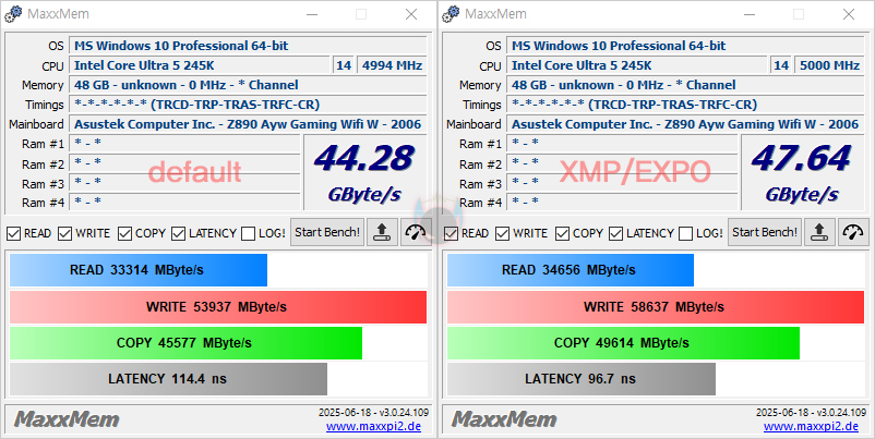 이제부터는 DDR5-6000 48GB(24GBx2) 메모리의 성능을 확인해보는데, 인텔 코어 울트라 시리즈2 시스템 기반에서 CPU-Z 프로그램을 통해 해당 모델의 기본 작동 클럭과 램 타이밍값을 확인해 보면, 기본 작동은 4800 MHz이며, 6000 MHz은 XMP/EXPO 프로파일로 적용된걸 확인할 수 있습니다. 그래서, 메인보드 CMOS에서 저장된 XMP/EXPO 프로파일값을 불러오면, 6000MHz 클럭과 그에 따른 타이밍값으로 적용되어 작동되는 걸 확인할 수 있습니다. 특히, 타이밍값을 보면, CL28로 이는 현재 DDR5에서 가장 낮게 잡을 수 있는 그러니깐 접근속도를 가장 빠르게 잡을 수 있는 최저값입니다.