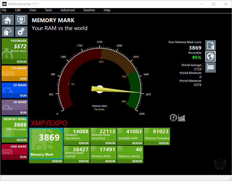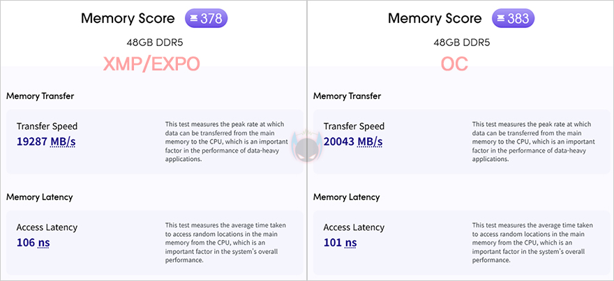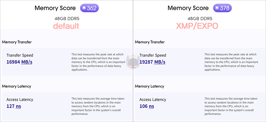 기본 작동(4800 MHz)일 때와 XMP/EXPO 프로파일(6000 MHz)을 적용했을 때 성능을 비교해 보면, AIDA64의 Cache&Memory Benchmark를 비롯한 모든 메모리 벤치마크에서 XMP/EXPO 프로파일을 불러왔을 때 성능이 향상되는 걸 확인할 수 있습니다. 정확히는 대역폭도 늘어났고, 레이턴시(Latency) 접근속도도 빨라진 거죠. 점수로 합산해 주는 Novabench나 PassMark의 PerformanceTest에서도 점수가 올라간 것을 확인할 수 있습니다. 오버클럭을 잘 모르는 초보자라도 XMP/EXPO 프로파일로 손쉽게 성능향상을 기대할 수 있는 부분이죠. 특히, 이 제품은 같은 경우에는 앞서 언급했듯이 빠른 레이턴시를 위해 CL28 타이밍 설정을 해놨기 때문에 작업용 메모리는 원하는 소비자입장에선 더 끌릴 수 있습니다.