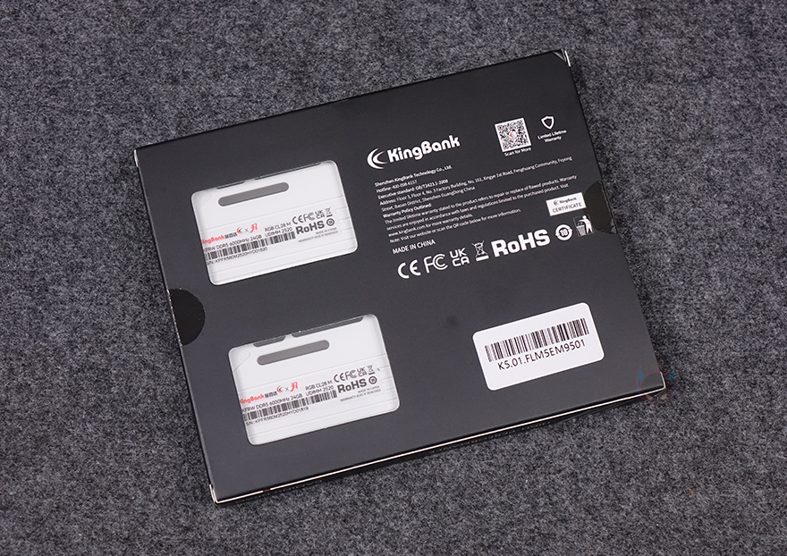 제품 패키지는 박스형태로 기존 제품들과 마찬가지로 킹뱅크 제품들은 특별히 박스 패키지에 상품별 디자인을 적용하지 않습니다. 모두 동일한 디자인의 박스 패키지죠. 대신에 박스 후면에 해당 제품 모델을 확인할 수 있게, 내부 포장된 메모리에 부착된 스펙 표기 스티커가 노출되어 있습니다. 포장 역시 기존 제품들과 동일하게 투명-캡 방식이며, 메모리외에 다른 구성품은 없고, 개봉 시 RGB 메모리이기 때문에 메모리 상단 LED 바(Bar) 부분에 비닐이 부착되어 있습니다. 물론, 사용 전에 제거해야 합니다.