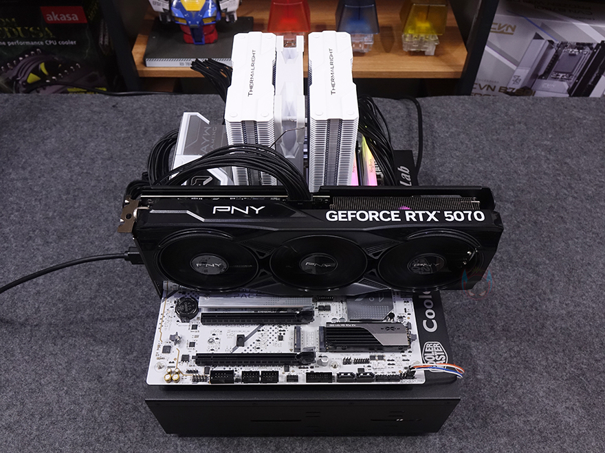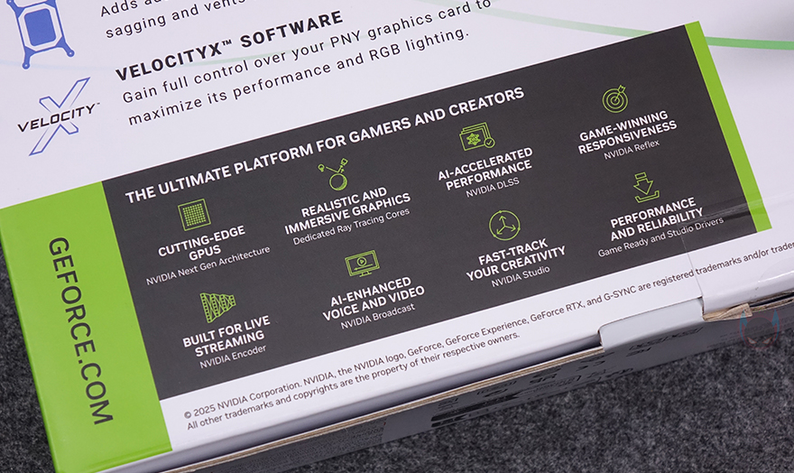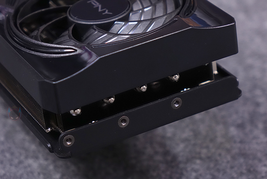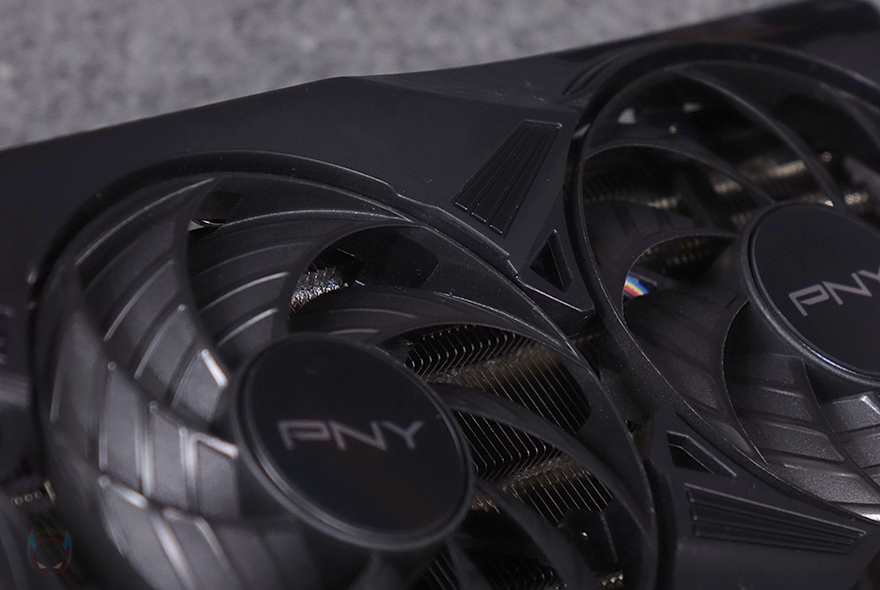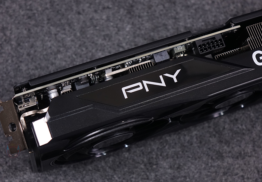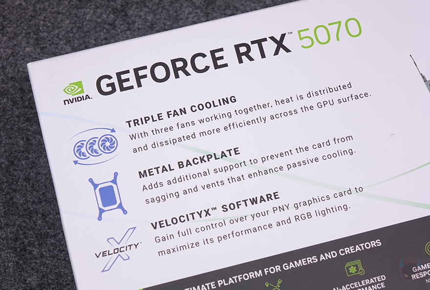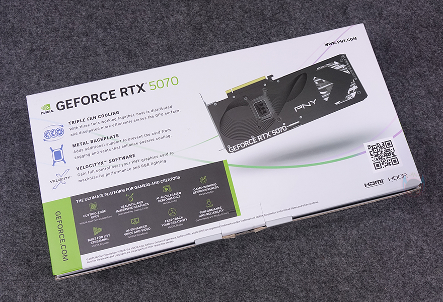 그래픽카드 바깥쪽 측면에는 쿨러 측면과 함께 왼쪽에는 PNY 로고를 표기해 놨으며, 오른쪽에는 지포스 RTX 5070 표기, 그리고 중앙에는 PCB기판에 적용된 PCIe 12-2x6 보조전원 커넥터 배치를 확인할 수 있습니다. 또한, PCI 슬롯과 반대편인 측면에는 쿨러의 히트파이프 노출과 함께 그래픽카드 지지대와 연결할 수 있는 나사홀도 적용되어 있죠. 그래픽카드 후면에는 제품 박스에서 확인했던 메탈재질의 백플레이트가 기본 장착되어 있으며, 백플레이트 왼쪽에는 음각 디자인을, 오른쪽에는 발열 배출이 신속하도록 에어홀 디자인을 적용했습니다.