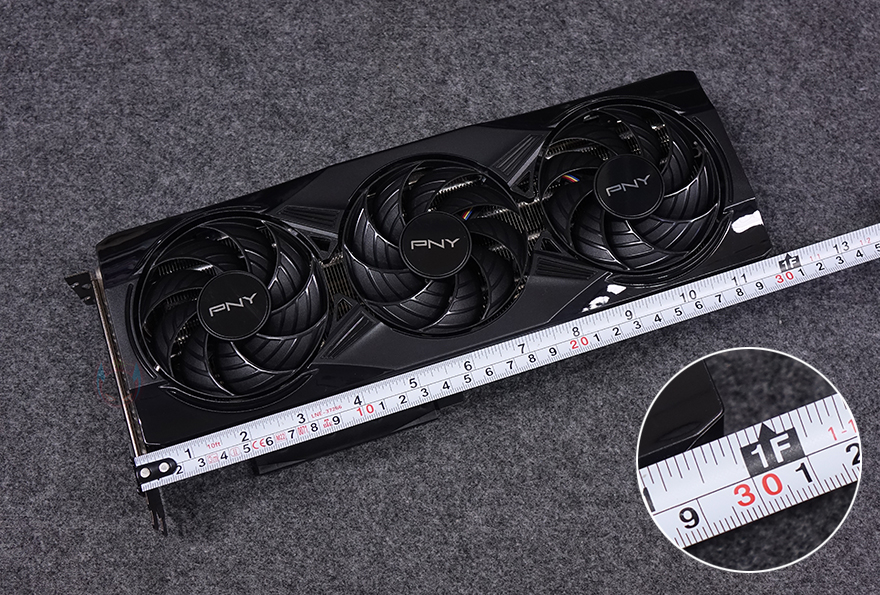 그럼, 본격적으로 PNY의 지포스 RTX 5070 OC D7 12GB Triple Fan 그래픽카드를 살펴보는데, 전체적인 디자인은 한눈에 봐도 시작에서 언급했던 블랙 감성 느낌을 알 수 있습니다. RGB 효과 없는 Non-RGB의 올-블랙 감성입니다. 또한, 그래픽카드 길이는 30cm로 트리플 팬 쿨러 장착기준에서도 최소 길이라 할 수 있고, 측면에서 높이를 보면 PCI슬롯 2단을 살짝 넘는 수준이죠. 앞서 언급한 최근 주목받고 있는 SFF 조립 PC까지 고려한 거죠.
