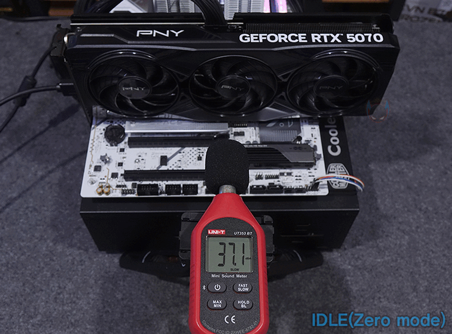직접, PNY 지포스 RTX 5070 OC D7 12GB Triple Fan 그래픽카드를 사용해 보면, 일단 Non-RGB 디자인을 가졌기 때문에 시스템에 전원이 들어와도 그래픽카드에서 따로 RGB 라이트닝 효과를 없습니다. 그리고, 트리플 팬 쿨러는 앞서 제품 박스에서 언급했듯이 일정온도에 도달하기 전까지 팬이 작동하지 않는 제로팬 일명 스텔스 모드를 지원하고 있으며, 팬 작동 시에도 팬 날개만 돌아가고 팬 중앙 로고 부분은 그대로 고정된 상태임을 확인할 수 있죠.