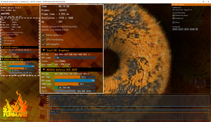 이번엔 PNY 지포스 RTX 5070 OC D7 12GB Triple Fan 그래픽카드의 쿨링 성능을 확인해 보는데, Furmark를 10분간 실행해 과부하 Load 상태에서 GPU와 VRAM 온도를 확인해 본 결과, 약 75℃와 70℃로 준수한 편임을 확인할 수 있습니다. 또한, 팬 소음도 과부하전 제로팬 모드일 때는 CPU쿨러와 파워서플라이의 팬 소음만 있는 상태인 약 37dB(A)에서 과부하가 시작되었을 때 최대 49dB(A)까지만 올라가는 걸 확인할 수 있어서, 전체 시스템 팬 소음도 정숙한 편이라, 그래픽카드 자체의 쿨러 소음은 걱정하지 않아도 되겠습니다. 끝으로, PNY 지포스 RTX 5070 OC D7 12GB Triple Fan 그래픽카드는 RGB 라이트닝 효과는 없지만, 오버클럭과 RGB 라이트닝을 관리할 수 있는 공용 프로그램 VelocityX를 지원합니다. 실제로 VelocityX 프로그램을 설치해 실행해 보면, RGB 관리설정은 없지만, 해당 그래픽카드 모델 인식과 함께 앞서 확인한 제로팬 모드를 상시 모드로 변경하거나 수동조절할 수 있고, 작동상태를 그래프로도 확인할 수 있으며, 추가 오버클럭을 시도해 볼 수 있게 코어와 메모리 클럭조절도 가능하고, 자동으로 측정하는 OC스캔 기능도 사용 가능합니다. 물론, 과도한 오버클럭으로 인한 문제는 소비자의 책임이기 때문에 신중히 선택해야 합니다.