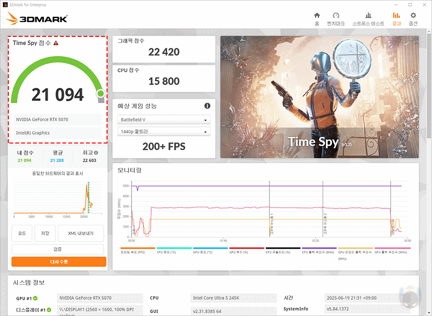 그럼 이제, PNY 지포스 RTX 5070 OC D7 12GB Triple Fan 그래픽카드의 성능을 확인해 보는데, 시스템 기반은 인텔 코어 울트라5 245K CPU와 DDR5 메모리에서 현재 가장 접근속도가 빠른 CL28 램 타이밍값으로 적용했으며, 비교 그래픽카드는 메인스트림급이지만, 지포스 RTX 5070과 동일한 메모리 12GB 용량을 가진 인텔 아크 B580으로 선택했습니다. 그리고, 해상도는 QHD로 설정해 진행했으며, GPU-Z를 통해 PNY PNY 지포스 RTX 5070 OC D7 12GB Triple Fan 모델의 GPU와 메모리 클럭값을 확인해 보면, 레퍼런스 사양보다 높은 즉 오버클럭 사양임도 확인할 수 있죠.