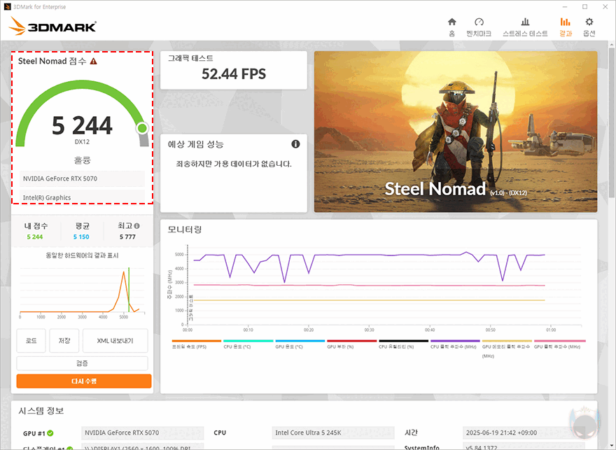 먼저, 점수 벤치마크로 가장 많이 사용되는 3DMark에서 다이렉트X 12 기반으로 성능측정할 수 있는 항목들로 진행했는데, Time Spy, Speed Way, Steel Nomad 모두에서 PNY 지포스 RTX 5070 OC D7 12GB Triple Fan 그래픽카드가 약 2배가량 높은 성능을 보이면서 체급차이를 확실히 보여줍니다. 뿐만 아니라, 레이트레이싱으로 성능비교를 할 수 있는 Port Royal과 DirectX Raytracing feature test 항목에서도 점수와 프레임 모두 2배 이상 차이 나는 걸 확인할 수 있죠.