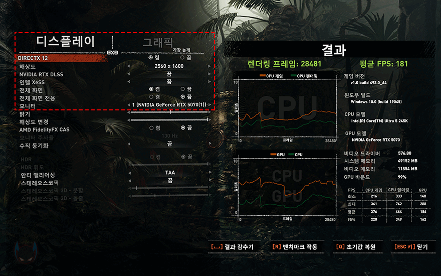 이번엔 다이렉트X 12 기반의 게임 프레임 벤치마크로 성능비교를 해보면, 최근 출시한 몬스터헌터 와일즈를 시작으로 검은 신화:오공, 사이버펑크 2077, 쉐도우 오브 툼레이더까지 모든 테스트 결과에서 PNY 지포스 RTX 5070 OC D7 12GB Triple Fan 그래픽카드가 인텔 아크 B580보다 앞서는 결과를 보여줬으며, 프레임향상의 DLSS나 XeSS를 끈 상태에서도 앞서는 결과를 보여줬고, 최대 2배 정도 프레임차이를 보여주는 결과도 보여줘서 확실히 메인스트림급 바로 위에 하이엔드 그래픽카드 시작급임을 보여줍니다.