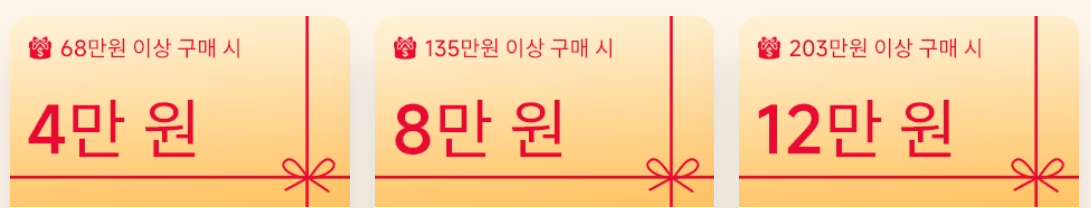 | 68만원이상 구매시, 4만원 할인코드 | 135만원이상 구매시, 8만원 할인코드 | 203만원이상 구매시, 12만원 할인코드 |