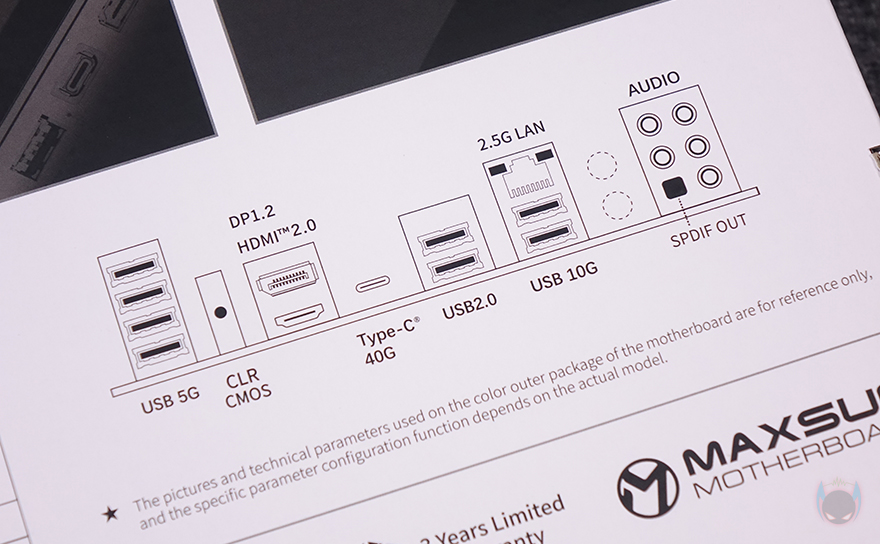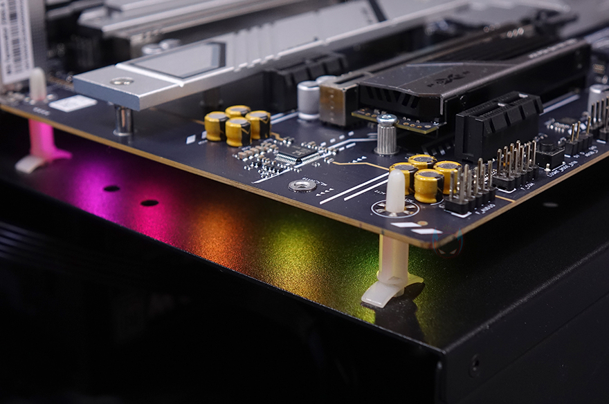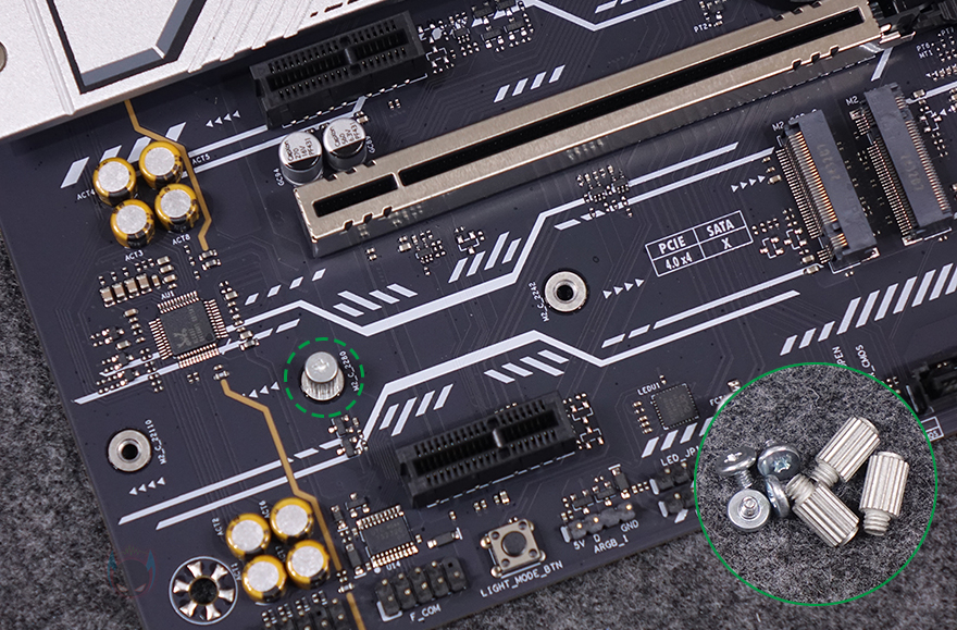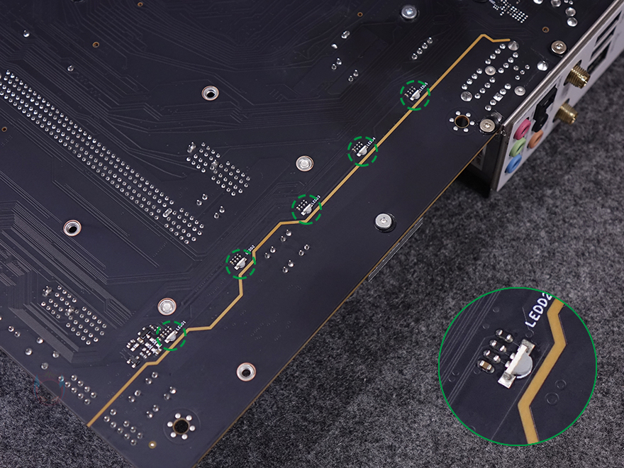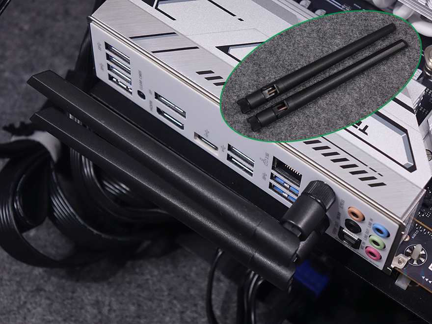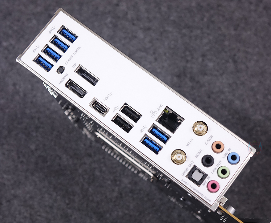 PCIe 슬롯 맨 왼쪽으로는 내장 오디오 구간으로 독립 PCB 구간으로 처리해 놨으며, 오디오 칩셋은 리얼텍(Realtek)사입니다. 또한, 분리 구간 맨 아래 오른쪽에는 라이트 모드(Light Mode) 온보드 버튼이 배치되어 있는데, 바로 PCB 분리 구간 후면에 LED가 적용되어 라이트닝 효과를 볼 수 있게 갖추고 있죠. 끝으로, 후면 백패널 I/O 포트 부분에는 실드가 기본 장착되어 있으며, 포트구성에는 맨 위에서부터 USB 3.2 Gen1 포트 4개, CMOS 클리어 버튼, 모니터 출력에 HDMI와 디스플레이 포트(DP), USB 4.0 Type-C 포트, USB 2.0 포트 2개, USB 3.2 Gen2 포트 2개, 2.5 GbE 랜포트, Wi-Fi 안테나 모듈, 오디오 포트들이 배치되어 있습니다. 참고로, Wi-Fi 모듈은 Wi-Fi 6이며, 제공되는 Wi-Fi 안테나는 기본적인 나사방식입니다.