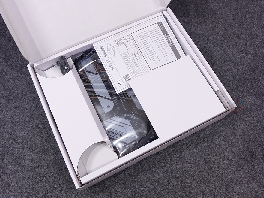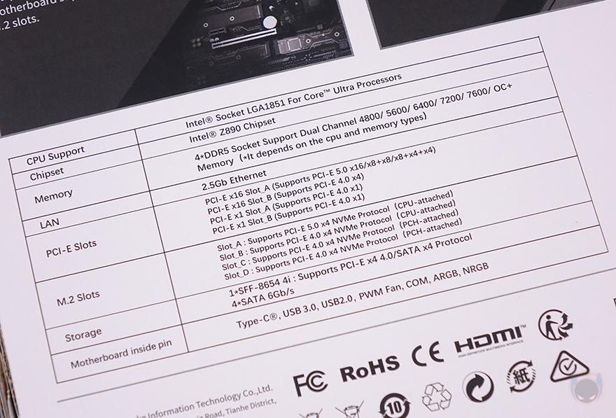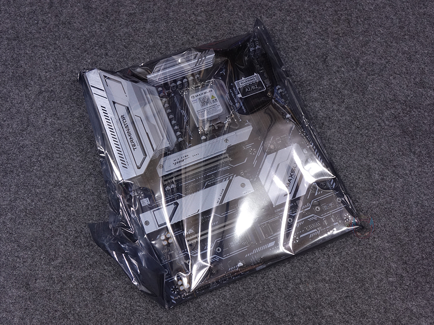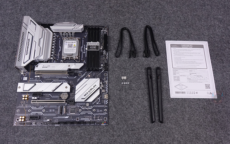 박스를 열어보면, 메인보드는 기본적으로 정전기방지 보호비닐에 포장되어 있으며, 보증서를 제외한 나머지 구성품들도 개별 비닐 포장으로 처리되어 있습니다. 전체 제품 구성에는 Terminator Z890-A WIFI 메인보드, S-ATA 케이블, SSD 장착에 사용되는 볼트 및 나사, Wi-Fi 안테나, 보증서 제공으로 이루어져 있는데, 박스부터 패키지 구성까지 살펴보면 메이저 브랜드 부럽지 않게 기본 구성에 충실하죠.