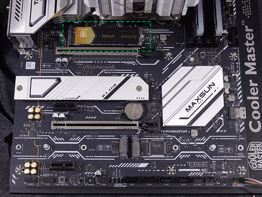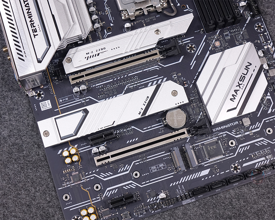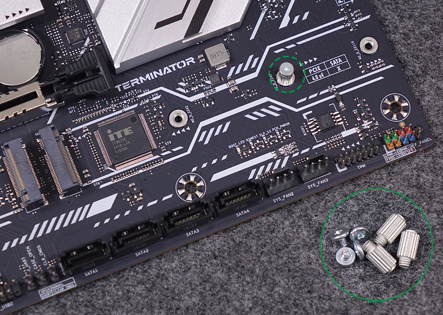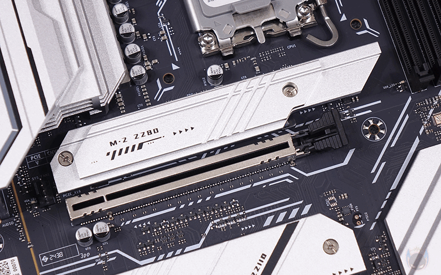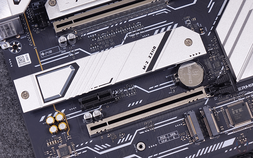 PCIe 슬롯은 총 4개 슬롯을 구성하고 있으며, 그래픽카드(VGA)를 장착할 수 있는 1번과 3번 슬롯은 각각 PCIe 5.0x16배속과 PCIe 4.0x4배속 규격이고, 나머지 2개의 슬롯은 PCIe 4.0x1배속 규격을 가졌습니다. 또한, 그래픽카드 장착 슬롯은 내구성 강화를 위해 스틸 아머 디자인을 적용해 놨으며, 1번 슬롯 바로 위에는 M.2 SSD 1번 슬롯이 배치되어 있는데, PCIe 5.0x4 규격으로 방열판 기본 장착에 2242/2280 사이즈를 장착할 수 있습니다. 물론, 방열판 안쪽과 슬롯 아랫부분에는 발열해결을 위해 써멀패드도 기본 부착되어 있죠. 또한, 2번 슬롯 바로 위에도 방열판 장착과 함께 M.2 SSD 2번 슬롯이 배치되어 있는데, PCIe 4.0x4 규격이며, 방열판 안쪽에 써멀패드가 기본 장착되어 있으며, 2242/2280/22110 사이즈를 장착할 수 있게 지원하고 있습니다. 그리고, 3번 PCIe 슬롯 바로에는 방열판 없이 M.2 SSD 슬롯 3번과 4번이 각각 배치되어 있는데, M.2 SSD 2번 슬롯과 동일한 규격에 사이즈 장착을 지원하며, M.2 SSD 1번 슬롯은 제외한 모든 슬롯에는 앞서 구성품에서 확인한 SSD 장착에 사용되는 볼트와 나사를 사이즈 위치에 장착해서 사용하면 됩니다. 참고로 M.2 SSD 4번 슬롯 아래에는 S-ATA 커넥터 4개가 배치된 것도 확인할 수 있죠.