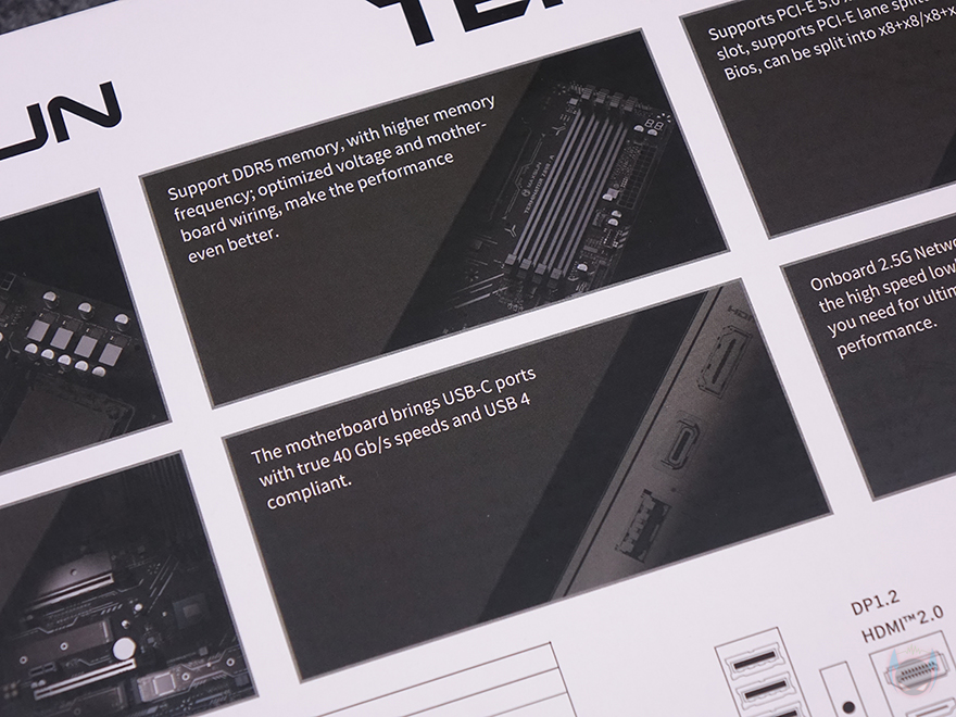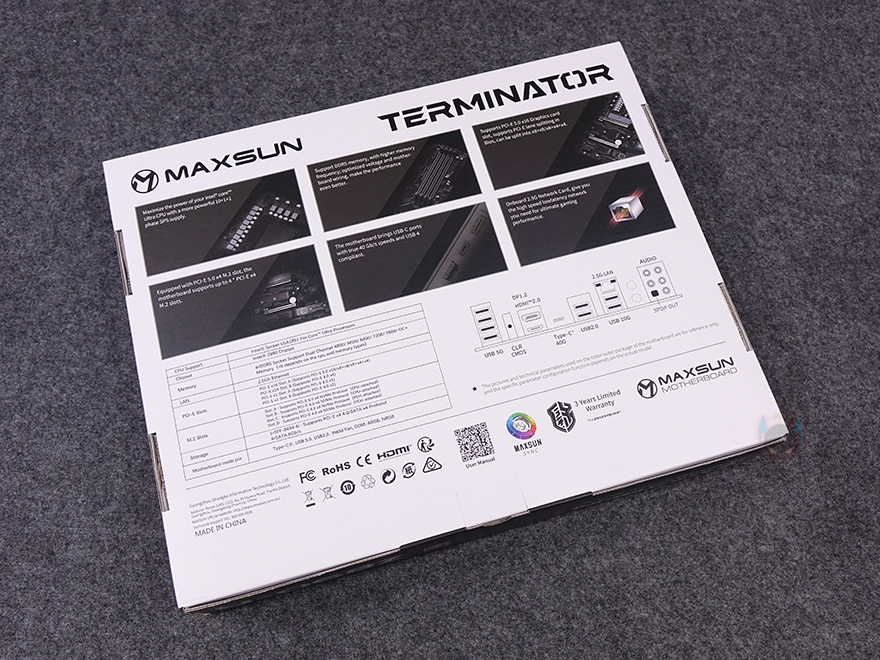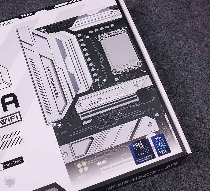 제품박스부터 살펴보면, Terminator(터미네이터) 시리즈는 이전 세대에서도 박스 전면에 제품 이미지를 일부 담고 있었는데, Terminator Z890-A WIFI 역시 전면 한쪽에 절반정도의 제품 이미지를 받고 있습니다. 그리고, 바로 왼쪽에 모델명도 함께 표기를 해놨죠. 박스 후면에는 제품의 주요 특징을 표기해 놨는데, 전원부, DDR5 메모리 지원, PCIe 5.0x16 슬롯 지원, PCIe 5.0x4 M.2 SSD 지원, USB4 지원, 2.5G 랜(LAN) 지원을 언급하고 있습니다. 그리고, 아래에는 백패널 I/O 포트 구성 표기와 제품의 기본 사양 표기를 해놨습니다. 오프라인 매장에서 구입하더라도 충분히 정보를 얻을 수 있습니다.