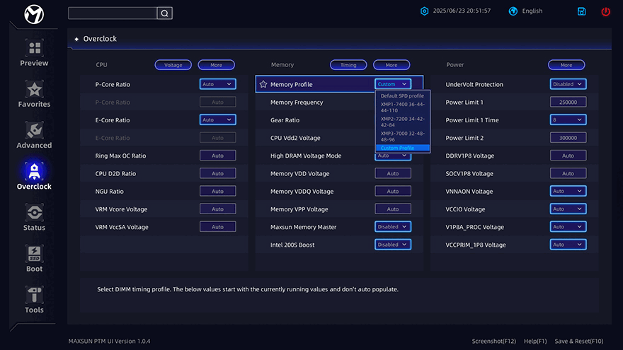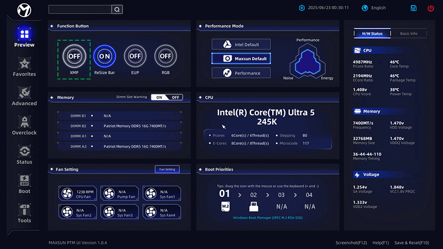 MAXSUN(맥선) Terminator Z890-A WIFI 메인보드를 시스템 구성을 통해 직접 사용해 보면, 일단 전원이 들어오면 앞서 메인보드 맨 아래에 배치된 라이트 모드 버튼(Light Mode button)을 통해 Off를 포함한 총 6가지 모드효과를 메인보드 후면에서 작동되는 걸 확인할 수 있습니다. 물론, 메모리 같은 RGB Sync를 지원하는 부품을 장착했을 때는 MAXSUN Sync와도 연동이 됩니다. 그리고, 바이오스 CMOS로 들어가 보면, 자사 최신 플래그쉽 메인보드에서부터 적용되기 시작한 모바일 앱에서 영감을 얻은 새로운 인터페이스 디자인 PMT를 확인할 수 있습니다. 맨 왼쪽에 배치된 메인 메뉴(Preview, Favorites, Advanced, Overclock, Status, Boot, Tools) 6개를 각 메뉴별로 선택했을 때 한눈에 속성 메뉴들을 확인할 수 있습니다.
