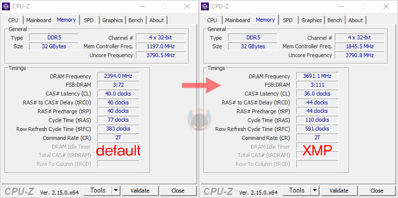 다만, 수동 오버클럭에서는 아직 호환성이 불안정한데, 정확히는 DDR5에서 현재 인기가 많은 하이닉스 A-다이(Die)와 M-다이를 기준으로 A-다이 메모리를 사용했을 때는 비교적 수동 오버클럭이 수월한 반면, M-다이를 사용했을 때는 수동 오버클럭이 잘 되지 않습니다. 이유는 전압 설정이 아직 제대로 수동적으로 적용되지 않는 것으로 추측되며, 일단, 수동 오버클럭시에는 메모리 전압을 따로 설정할 필요 없이, 1.435V까지 기본 전압으로 잡아주고 있습니다. 그래서, 클럭만 올려주면, XMP 프로파일의 램 타이밍값을 유지한 상태에서 최대 클럭까지 올려볼 수 있습니다.