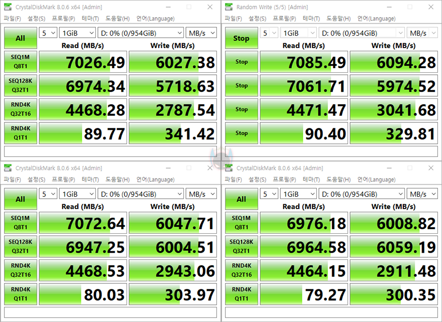 끝으로, 저장장치 지원 성능을 확인해 보는데, Terminator Z890-A WIFI 메인보드에는 총 4개의 M.2 SSD 슬롯과 백패널에 USB 4.0 포트를 갖추고 있죠. 일단, M.2 SSD 같은 경우 1번 슬롯을 제외하고는 모두 PCIe 4.0x4까지 지원이라 1번 M.2 SSD 슬롯이 PCIe 5.0x4 지원이라고 현재 PCIe 5.0 NVMe SSD 가격이 높기때문에 대중적으로 많이 사용하는 PCIe 4.0x4 NVMe SSD로 모든 슬롯 속도 성능을 확인해봤습니다. CrystalDiskMark로 읽기와 쓰기속도를 확인해 본 결과, PCIe 4.0x4 규격에서 최대 평균으로 나오는 7000MB/s 대 읽기와 6000MB/s 대 쓰기 속도를 확인할 수 있죠. 그리고, 백패널 I/O 포트에 있는 USB 4.0 포트는 USB 4.0 지원의 외장 SSD로 읽기와 쓰기속도를 확인해 본 결과, USB 3.2 Gen2x2보다 빠른 3000MB/s 대 속도임을 보여줬습니다.