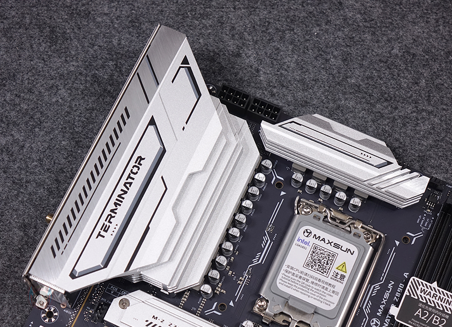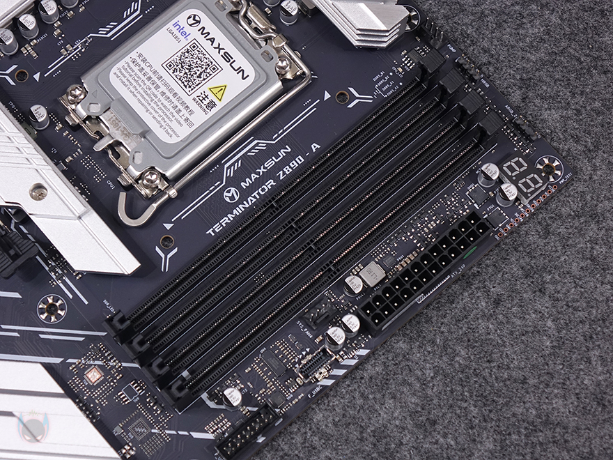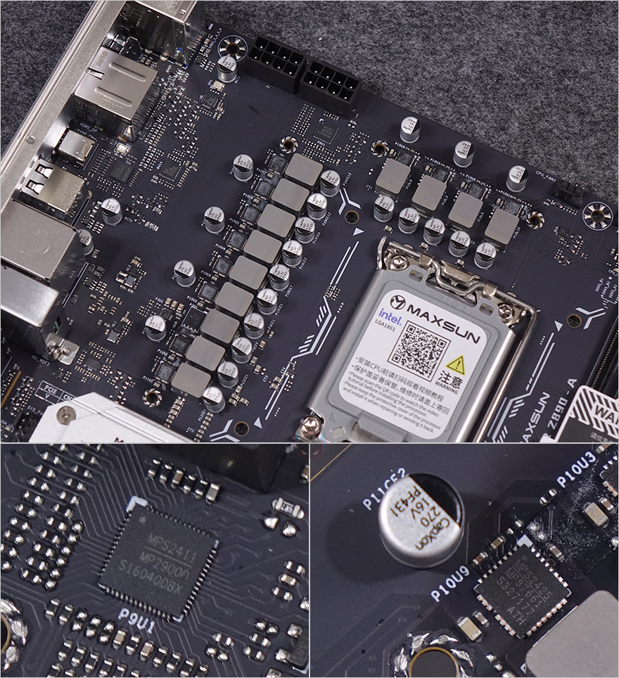그럼, 본격적으로 MAXSUN(맥선) Terminator Z890-A WIFI 메인보드(Motherboard) 레이아웃을 살펴보는데, ATX 폼-규격에 블랙 PCB 기판과 실버색상의 방열판(Silver Heatsink) 디자인을 적용하고 있습니다. 가장 전형적인 보급형 메인보드 디자인이죠. 좀 더 자세히 살펴보면, CPU 소켓은 Z890칩셋 기반이기 때문에 인텔 코어 울트라 시리즈2 CPU 지원으로 LGA1851 소켓 규격이며, 보호캡도 함께 적용되어 있습니다. 참고로, 보호캡에 있는 QR코드를 모바일로 보면 CPU 장착 가이드 영상을 보여줍니다. 그리고, CPU 쿨러는 LGA 1700과 호환되게 그대로 유지했죠. CPU 주변 전원부에는 모두 방열판(Heatsink)이 장착되어 있으며, 백패널 방향 방열판에는 TEMINATOR 라인업 명칭을 표기해 놨습니다. 물론, 방열판을 분리하면 안쪽에는 모두 전원부 발열 해결을 위해 써멀패드(Thermal Pad)가 부착되어 있으며, 전원부는 10+1+1 페이즈 구성으로 전원부 컨트롤러 칩셋과 모스펫 칩셋은 모두 Monolithic Power Systems사 칩을 사용했는데, 모스펫은 기본 Dr.MOS보다 한 단계 발전한 온도/센서/보호회로가 적용된 SPS 모스펫을 사용했습니다. 참고로 개당 최대 전력공급은 60A입니다. 그리고, PCB 기판은 8-레이어(Layer)입니다.