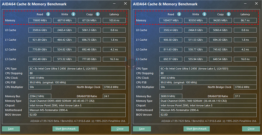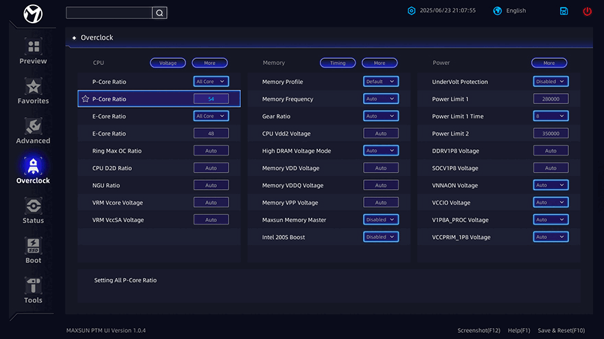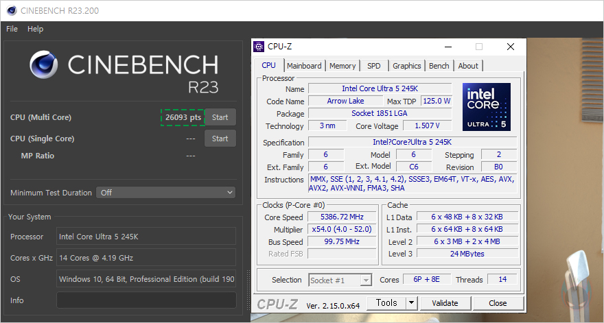 이제, Terminator Z890-A WIFI 메인보드에서 지원하는 주변 하드웨어 성능을 확인해 보는데, 먼저 CPU는 Z890칩셋 기반이기 때문에 인텔 코어 울트라5 시리즈2 245K CPU를 사용했고, 메인보드 바이오스도 최신 버전으로 업데이트한 상황에서 CPU 기본 작동 성능을 Cinebench R23으로 확인해보면, 랜더링 과부하시 최대 5.0GHz까지 작동되는걸 확인할 수 있습니다. 하지만, Terminator Z890-A WIFI 메인보드는 Z890칩셋 기반이기때문에 CPU 오버클럭을 지원합니다. 그래서, 바이오스 CMOS에서 Overclock 메뉴를 통해 P-코어(Core)와 E-코어(Core) 배수 설정과 전력해제를 통해 좀 더 끌어올려봤는데, 코어 울트라5 시리즈2 245K CPU 같은경우 평균 5.3~5.4GHz정도의 오버클럭 수율을 가진 것으로 알려져있으며, Terminator Z890-A WIFI 메인보드에서 5.4GHz으로 작동되는걸 확인할 수 있었습니다. 물론, 기본 작동일때보다 성능햐상도 이루어졌죠. 다만, 전압 같은 설정부분이 아직 완벽하지 않기때문에 좀 더 개선되어야할 부분이 있습니다.