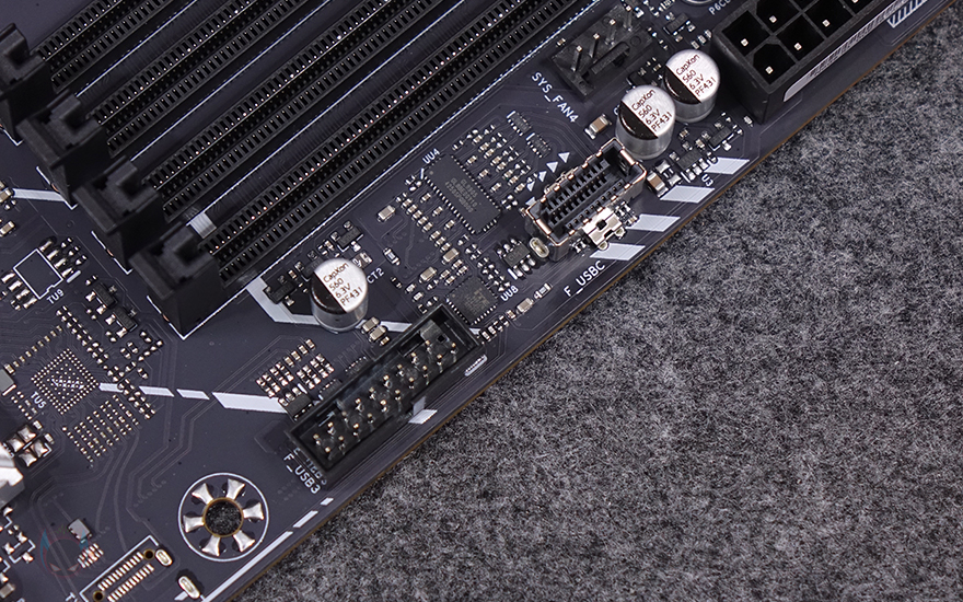메모리 슬롯은 DDR5 지원과 함께 총 4개 슬롯 구성으로 최대 256GB 용량까지 구성할 수 있으며, 클럭 지원은 홈페이지에 등록된 QVL 리스트 현재 기준으로 최대 9200 MHz 클럭까지 지원합니다. 이밖에 슬롯 주변에는 12V RGB와 5V ARGB 헤더가 하나씩 배치되어 있으며, 주변에 부팅 체크를 확인할 수 있는 디버그(Debug) LED와 전압 측정을 할 수 있는 프로브 포인트가 적용되어 있습니다. 또한, 아래로 좀 더 내려가면 슬롯 앞부분에 USB 3.2 Gen2x2 타입 C 헤더와 USB 3.2 Gen1 내부 헤더도 배치된 걸 확인할 수 있고, 더 내려가면 Z890 메인칩셋 옆에 소비자용 메인보드에서는 보기 드문 SAS(SFF-8654 4i) 인터페이스도 적용된 걸 확인할 수 있죠.