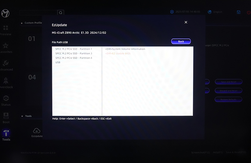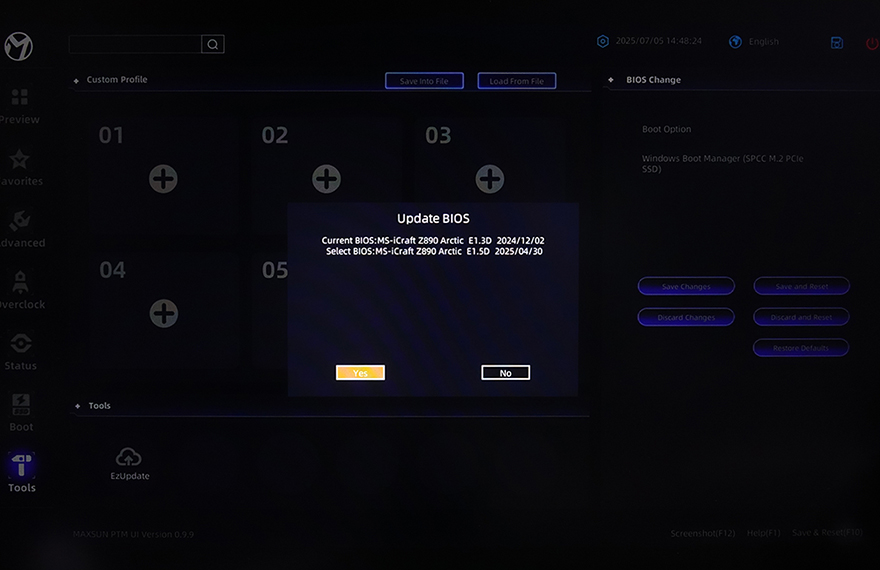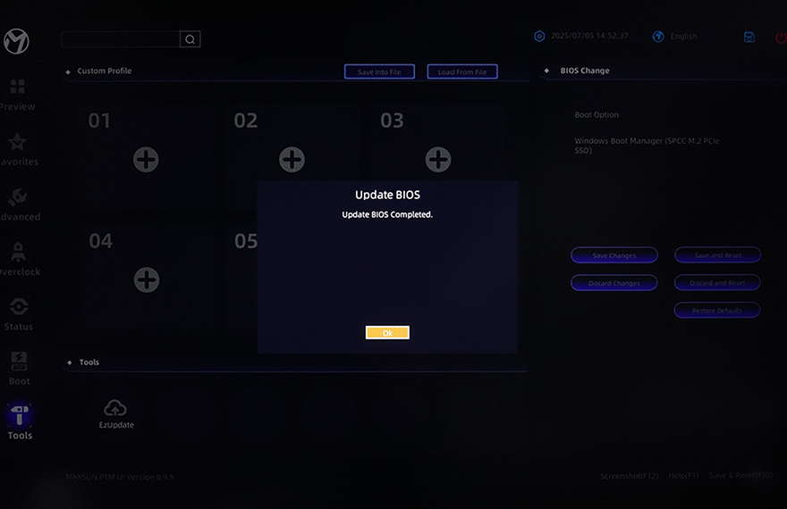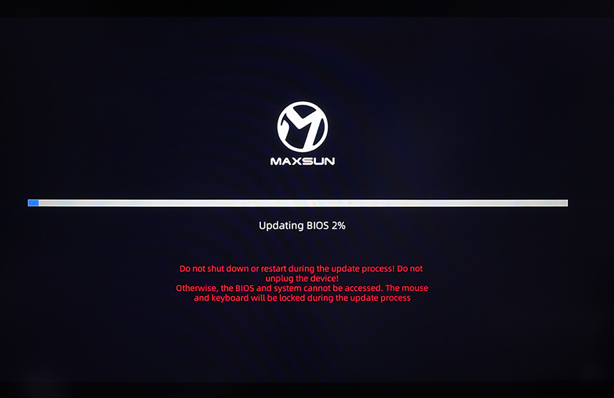 USB 메모리에 업데이트할 최신 바이오스 파일을 담은 후에는 메인보드 백패널 I/O 포트에 있는 USB 포트에 꽂고, 부팅을 해서 바이오스 CMOS로 들어간다. 그리고, CMOS 화면 맨 왼쪽 아래에 있는 Tools 메뉴로 들어가면, 바로 옆에 EzUpdate 메뉴를 확인할 수 있고, EzUpdate를 선택하면, 탐색기같은 화면이 뜬다. 해당 화면에서 오른쪽 USB 메모리 드라이버를 선택하면, USB 메모리에 담아둔 EZ Update BIOS 폴더를 확인할 수 있고, 폴더를 선택해서 들어가면, 업데이트할 최신 바이오스 파일을 확인할 수 있다. 그럼, 파일을 선택하면, 업데이트를 할지 최종 메시지가 뜨고, Yes를 선택하면 이후부터는 업데이트가 진행된다. 업데이트가 끝나면 완료되었다는 메시지를 다시 한 번 보여주고, OK를 선택하면 재부팅이 이루어진다. 그럼, 부팅시 다시 한 번 CMOS 화면으로 진입해 바이오스 버전을 확인하거나 운영체제에서 CPU-Z 같은 프로그램을 통해 업데이트가 정상적으로 적용되었는지 바이오스 버전을 확인하면 된다. MAXSUN의 이전 세대 메인보드까지는 Shell 바이오스 업데이트로 진행되었지만, PMT UI 바이오스가 적용되면서 메이저 브랜드처럼 CMOS에서 바이오스 업데이트를 진행할 수 있게 되어서 메이저 브랜드 메인보드 바이오스 업데이트를 해봤다면, 어렵지 않게 MAXSUN 메인보드 바이오스 업데이트도 할 수 있다.
