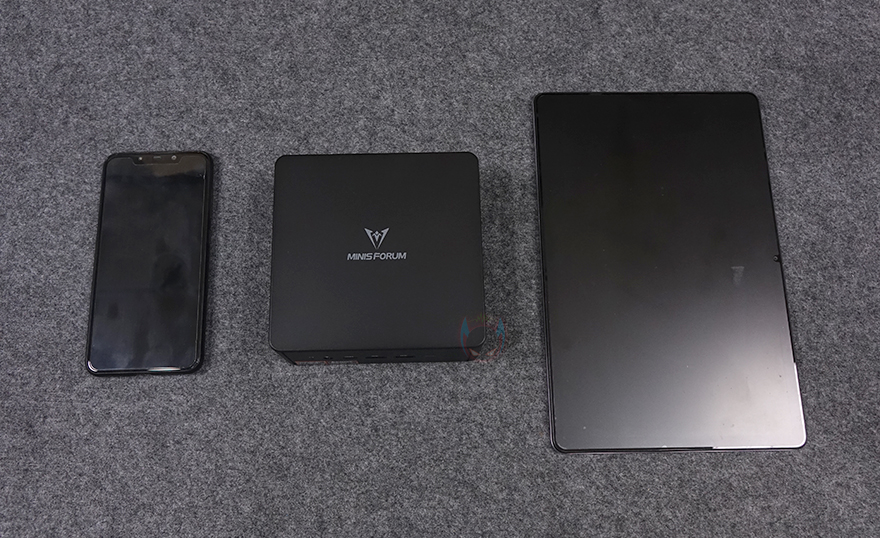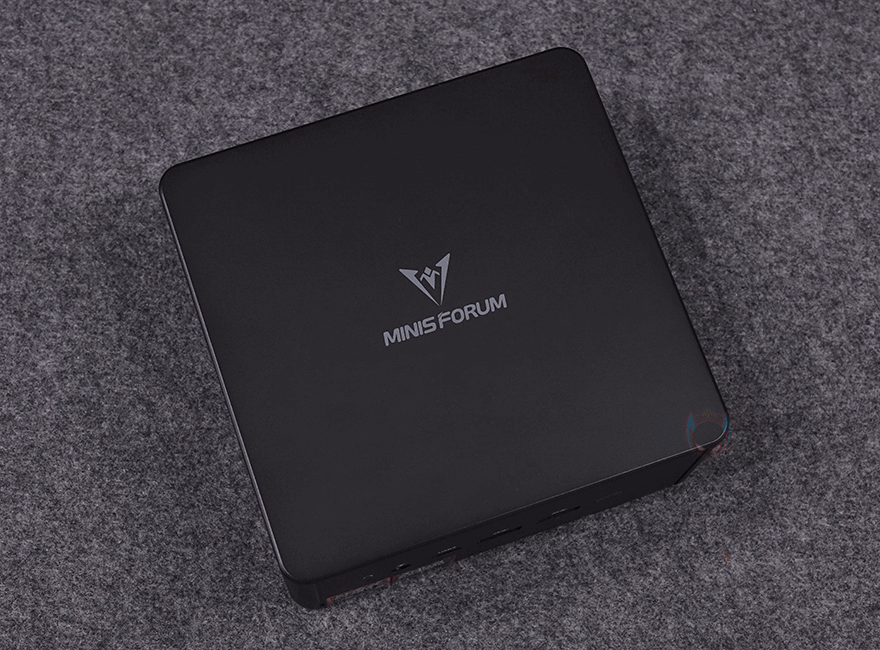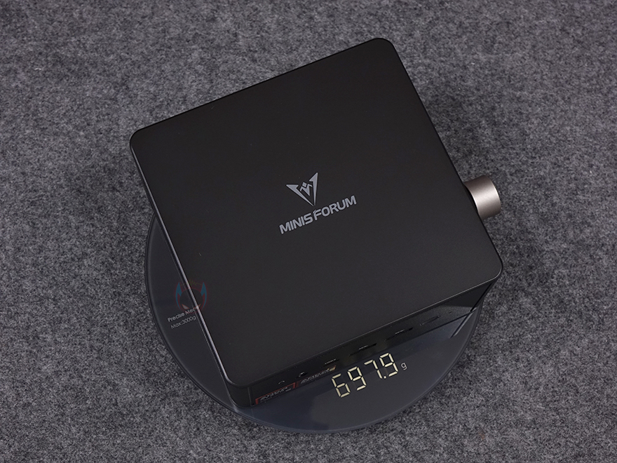 본격적으로 미니스포럼(Minisforum) 엘리트미니 UM890 PRO 미니 PC를 살펴보면, 색상은 블랙계열이며, 크기는 얼핏 보면 정사각형처럼 보이지만, 실제 사이즈는 127x130x66.6mm로 폭(Width)이 깊이보다 약간 짧습니다. 단면적 크기만 놓고 보면 스마트폰보다 크지만, 태블릿 PC보다는 면적이 작죠. 그리고, 무게는 32GB+1TB 옵션 기준으로 약 700g입니다. 그리고, 본체 상단에는 심플하게 MINISFORUM 로고만 새겨놨는데, 이 부분은 뒤에서 다시 한번 다루겠습니다.