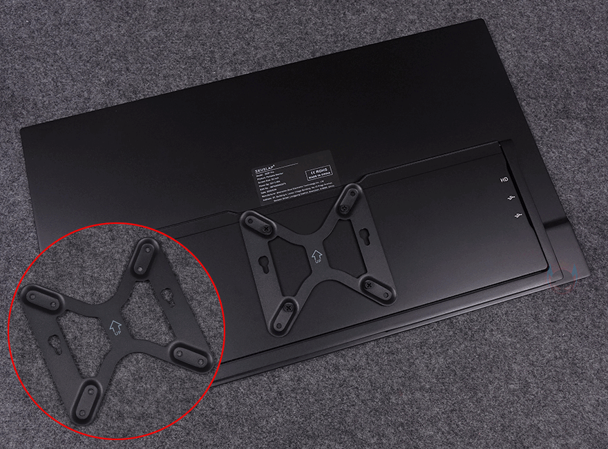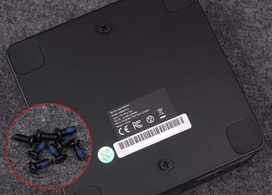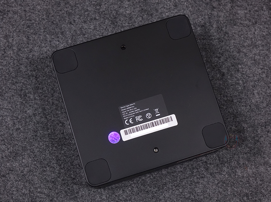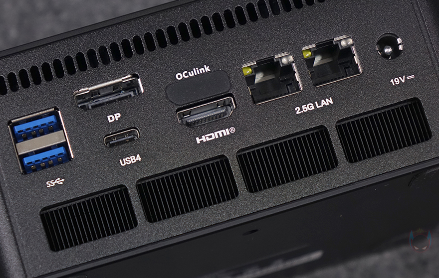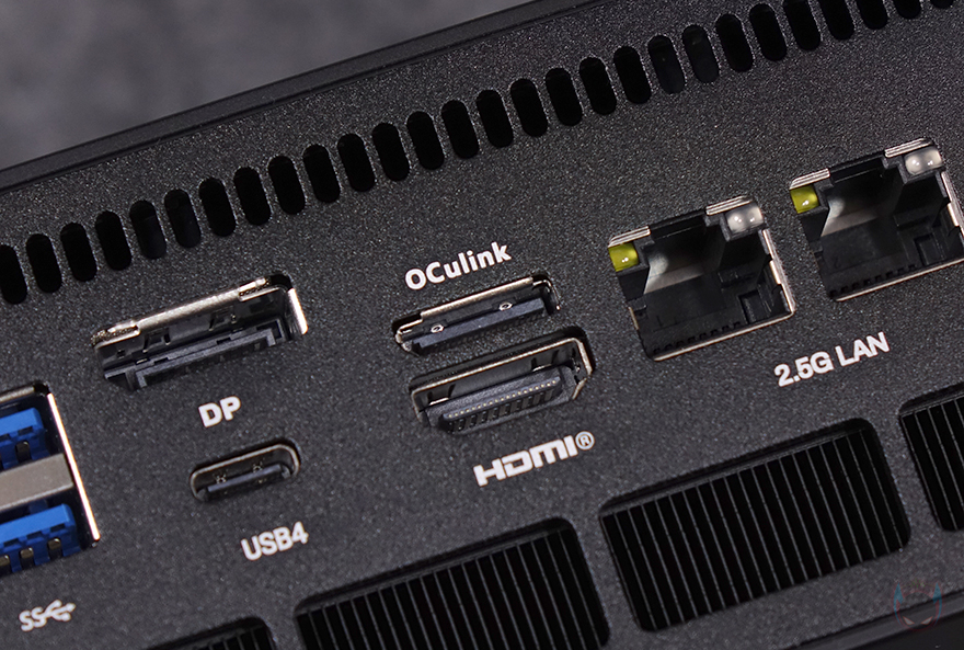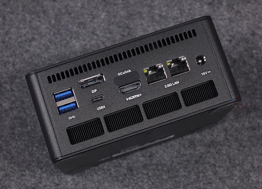 그리고, 본체 후면에는 일부 에어홀 처리와 함께 중앙에 포트들이 배치되어 있는데, 맨 왼쪽부터 USB 3.2 Gen2 포트 2개, DP 1.4 포트, USB 4 Type-C 포트, HDMI 2.1 포트, 2.5G 랜(LAN) 포트 2개, 전원 어댑터와 연결되는 DC 포트가 배치되어 있습니다. 또한, HDMI 포트 바로 위에는 OCulink 표기와 함께 포트 마개가 적용되어 있는데, 앞서 구성품에서 확인한 M.2 to OCulink 어댑터는 사용자가 선택하는 옵션이기 때문에 개봉 시에는 기본 장착되어 있지 않아 마개를 적용한 겁니다. 또한, 전면과 후면에 하나씩 배치된 USB 4 Type-C 포트는 PD(65~100W 입력, 15W 출력) 지원 외에 모니터 출력도 지원해 최대 8K@60Hz 해상도까지 지원합니다. 본체 밑바닥 부분에는 모서리 부근으로 미끄럼 방지 및 진동소음 최소화를 위한 패드를 기본 부착해 놨으며, 가로지르는 중앙 부분으로 나사홀이 있는데, 앞서 구성품에서 확인한 VESA 마운트(Mount)를 사용해 사용자 환경에 따라 모니터 후면에 장착할 수 있습니다. VESA 홀 규격은 75x75, 100x100mm 2가지 모두 지원하죠.