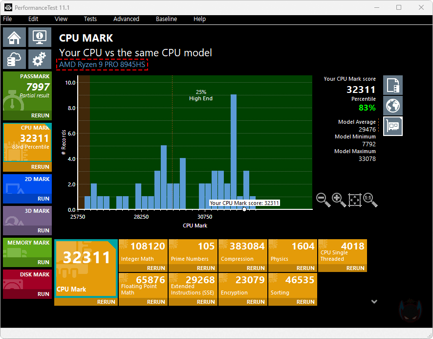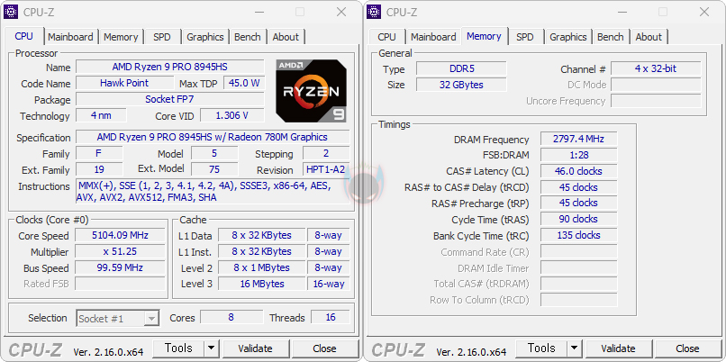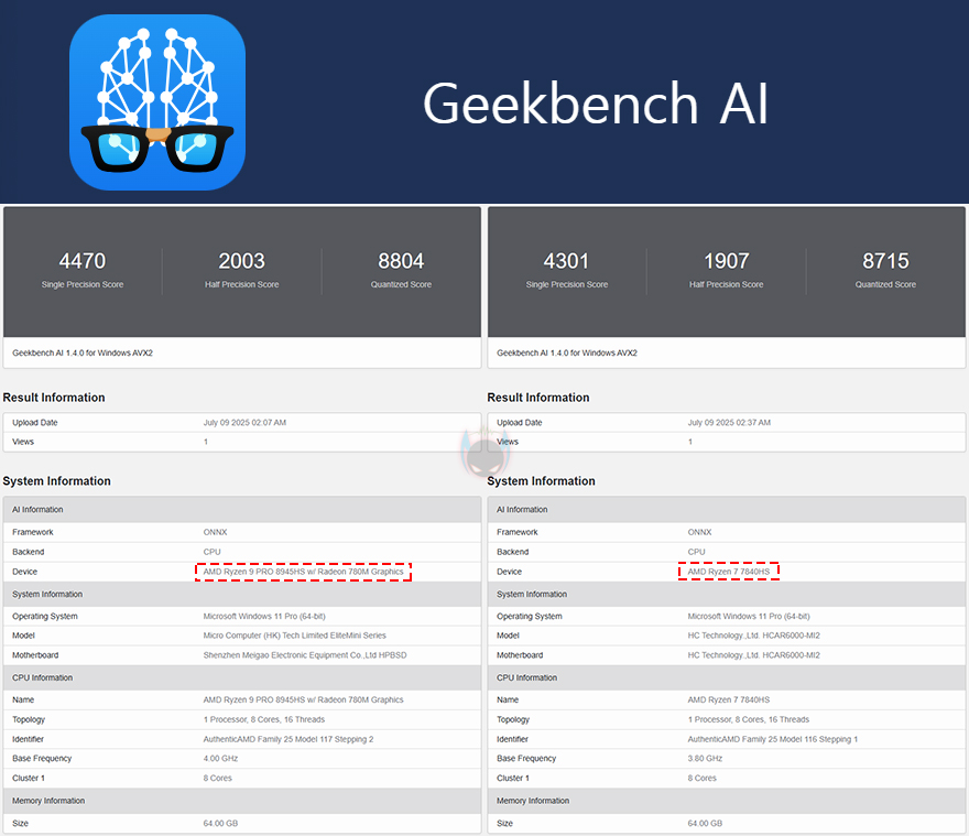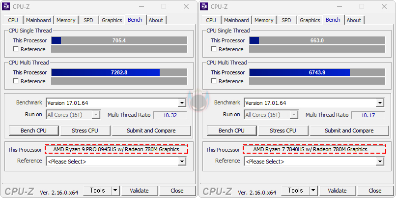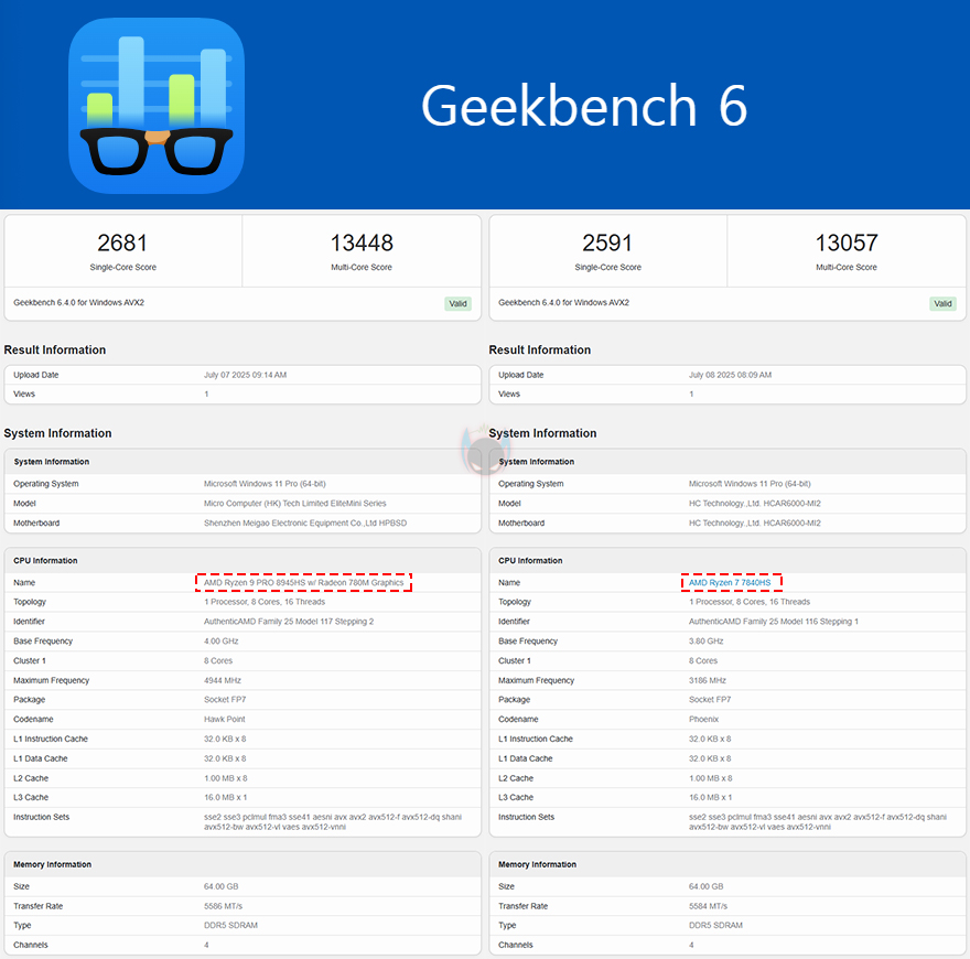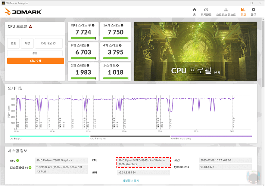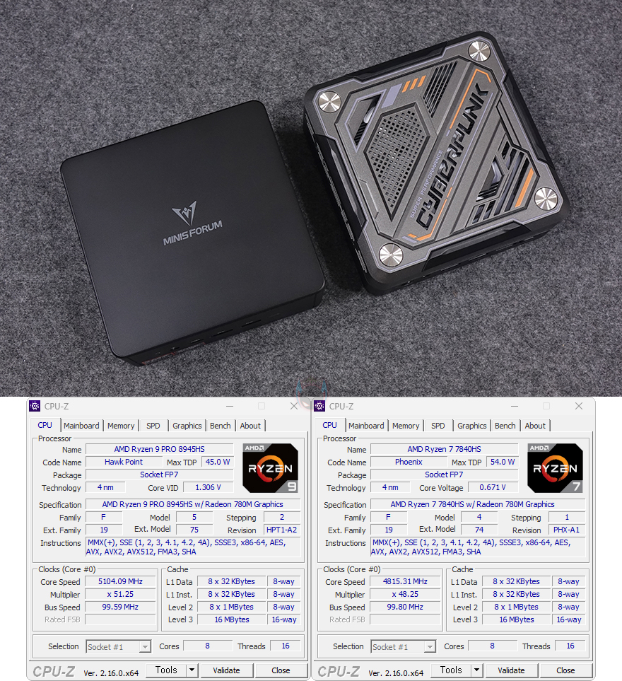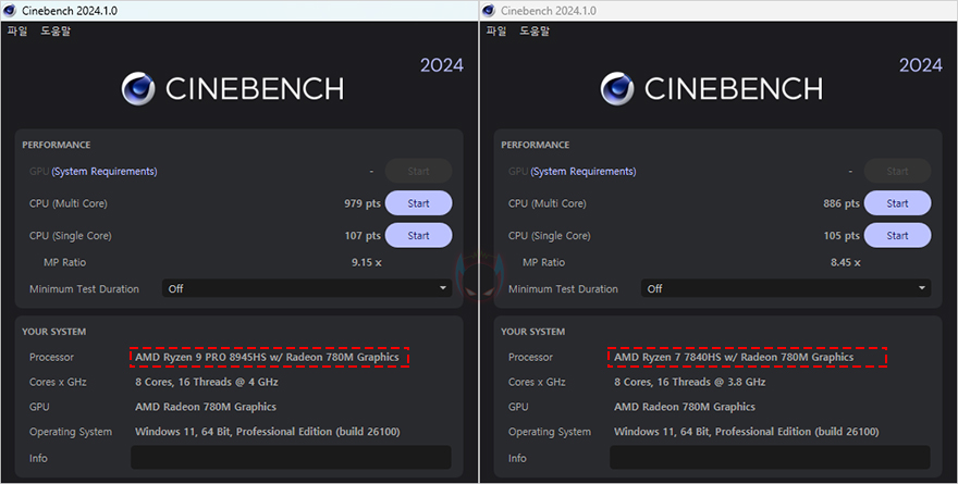 이제 엘리트미니 UM890 PRO 미니 PC의 성능을 확인해 보는데, 먼저 CPU 성능은 AMD 라이젠 9 PRO 8945HS CPU 즉 8000 시리즈가 탑재되어서, 이전 세대인 라이젠 7000 시리즈 모바일 CPU인 라이젠 7 7840HS CPU가 탑재된 미니 PC와 비교해 봤습니다. CPU-Z 프로그램에 내장된 Bench 항목을 비롯해, Geekbench, Cinebench R24, 3DMark CPU, Passmark Performance Test CPU Mark까지 CPU 위주로 테스트할 수 있는 벤치마크 프로그램에서 진행한 결과, 라이젠 9 PRO 8945HS CPU가 탑재된 엘리트미니 UM890 PRO 미니 PC가 모두 앞서는 성능 결과를 보여줬습니다. 코어와 스레드는 같지만, 세대차이가 있는 만큼 성능차이도 분명하게 보여줍니다.
