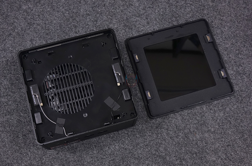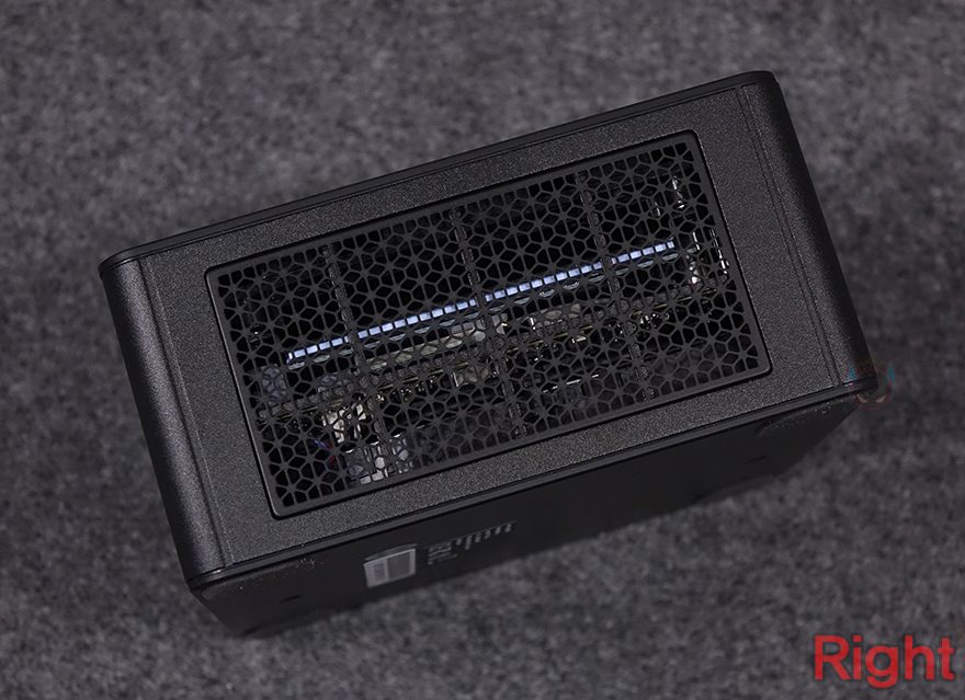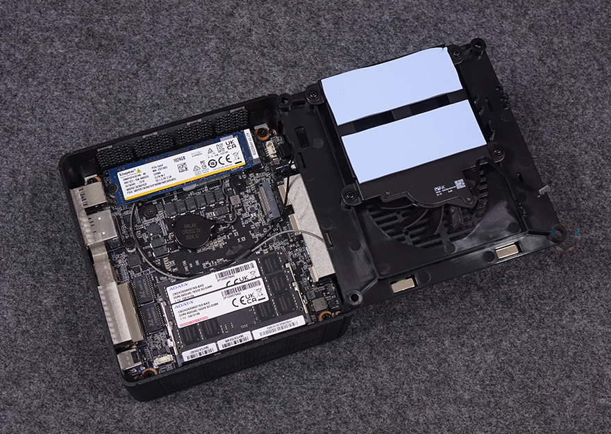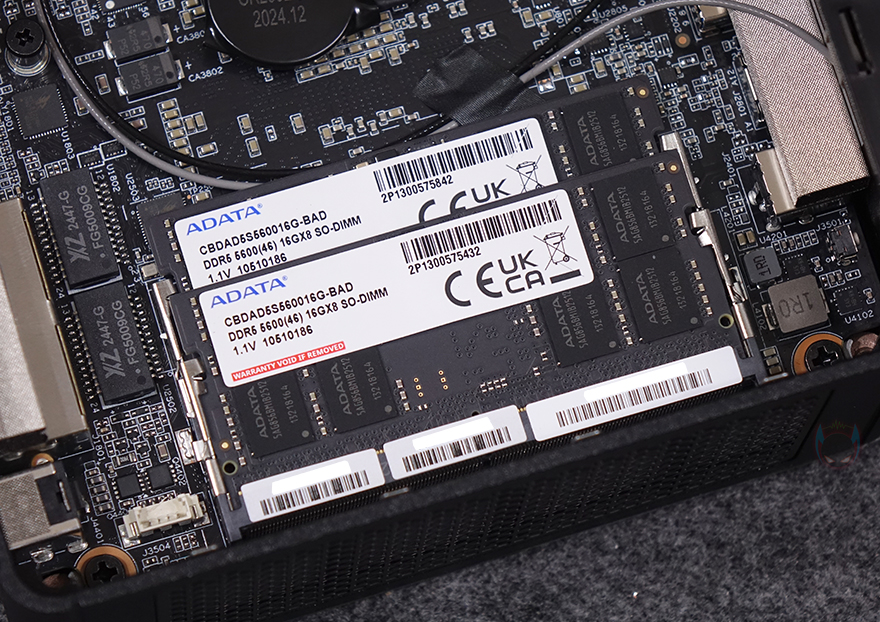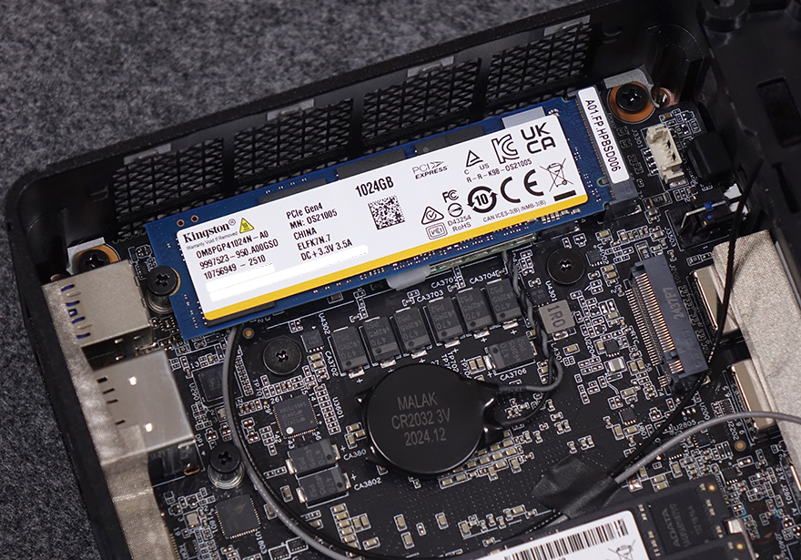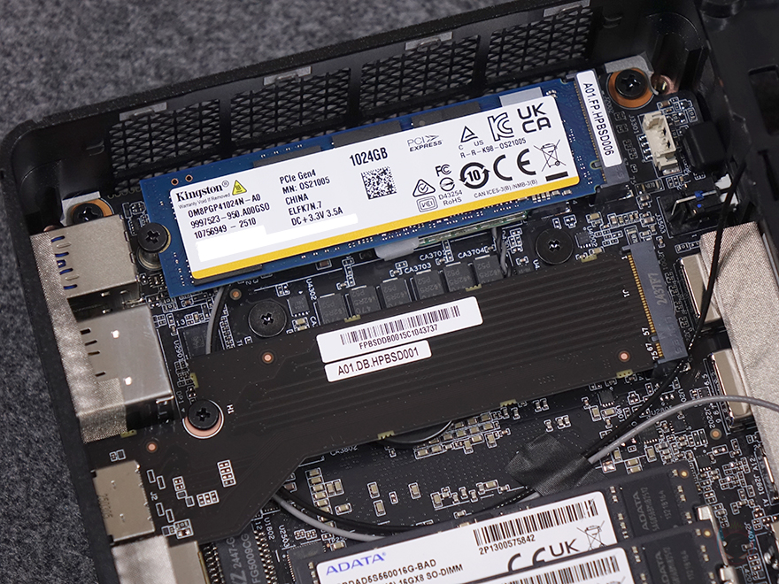 앞서 구매 옵션에서 엘리트미니(Elitemini) UM890 PRO 미니 PC는 베어본(Barebone) 옵션부터 구매가 가능하다고 언급했습니다. 다시 말해, 소비자가 RAM와 SSD를 장착할 수 있게 본체 분리가 가능하다는 거죠. 그리고, 이 분리는 바로 본체 상단에서 할 수 있습니다. 로고가 새겨진 상단은 자석(Magnetic) 방식의 커버로 손쉽게 분리가 가능합니다. 커버를 분리하면, 내부에 RAM와 SSD 쿨링효과를 위한 60mm 팬이 안쪽에 장착된걸 미리 확인할 수 있고, 모서리 부근에 있는 나사들을 풀면, 한 번 더 내부에 있는 커버를 분리할 수 있죠. 내부 커버를 분리하면 RAM와 SSD를 장착할 수 있는 슬롯(Slot)을 확인할 수 있는데, SSD 장착 위치에는 발열 해결을 위해 내부 커버 안쪽에 써멀패드(Thermal Pad)까지 기본 부착된 것을 확인할 수 있습니다. 리뷰에선 32GB+1TB 옵션 모델이기 때문에 RAM와 SSD가 기본 장착되어 있는데, RAM은 듀얼 채널(Dual channel) 구성이 가능하며, 최대 96GB 용량까지 지원하며, M.2 SSD 슬롯도 2개 구성으로 PCIe 4.0x4 규격까지 지원합니다. 참고로, RAM 클럭은 5600Hz 지원하죠. 그리고, 외부 eGPU를 사용하고 싶다면, 앞서 구성품에서 확인한 OCulink 어댑터를 M.2 SSD에 장착, 후면 HDMI 포트 위 OCulink 포트에 연결해 사용할 수 있습니다. 물론, eGPU를 사용하지 않는다면, M.2 SSD를 최대 2개 장착할 수 있는 거죠.