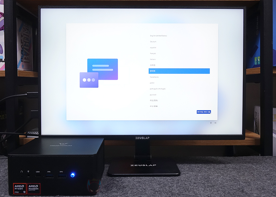 그럼, 이제 미니스포럼(Minisforum) 엘리트미니 UM890 PRO 미니 PC를 사용해 보는데, 리뷰에선 앞서 확인했듯이 32GB+1TB 옵션 제품입니다. 베어본을 제외한 RAM와 SSD가 장착된 옵션을 구입하면, 저장장치에 기본 운영체제가 설치되어 있어서, 첫 부팅 시 운영체제 설정 안내가 나옵니다. 안내에 따라 진행하면 초보자도 어렵지 않게 마무리할 수 있으며, 운영체제는 윈도우 11 Pro가 제공됩니다. 물론, 장치 드라이버 설치도 자동으로 다 마무리됩니다. 그리고, 탑재된 CPU는 AMD 라이젠 9 PRO 8945HS CPU이며, 메모리(RAM)는 DDR5-5600이 장착되었죠. 앞서 언급했듯이 CPU는 라이젠 9 8945HS 또는 라이젠 9 PRO 8945HS 2가지 중에 랜덤으로 장착되지만, CPU 사양이 동일하기 때문에 성능에는 차이가 없습니다.