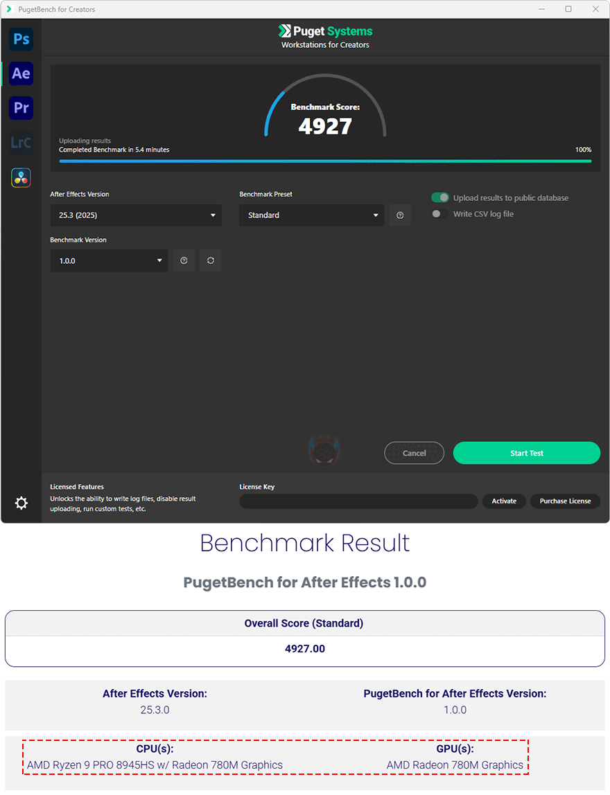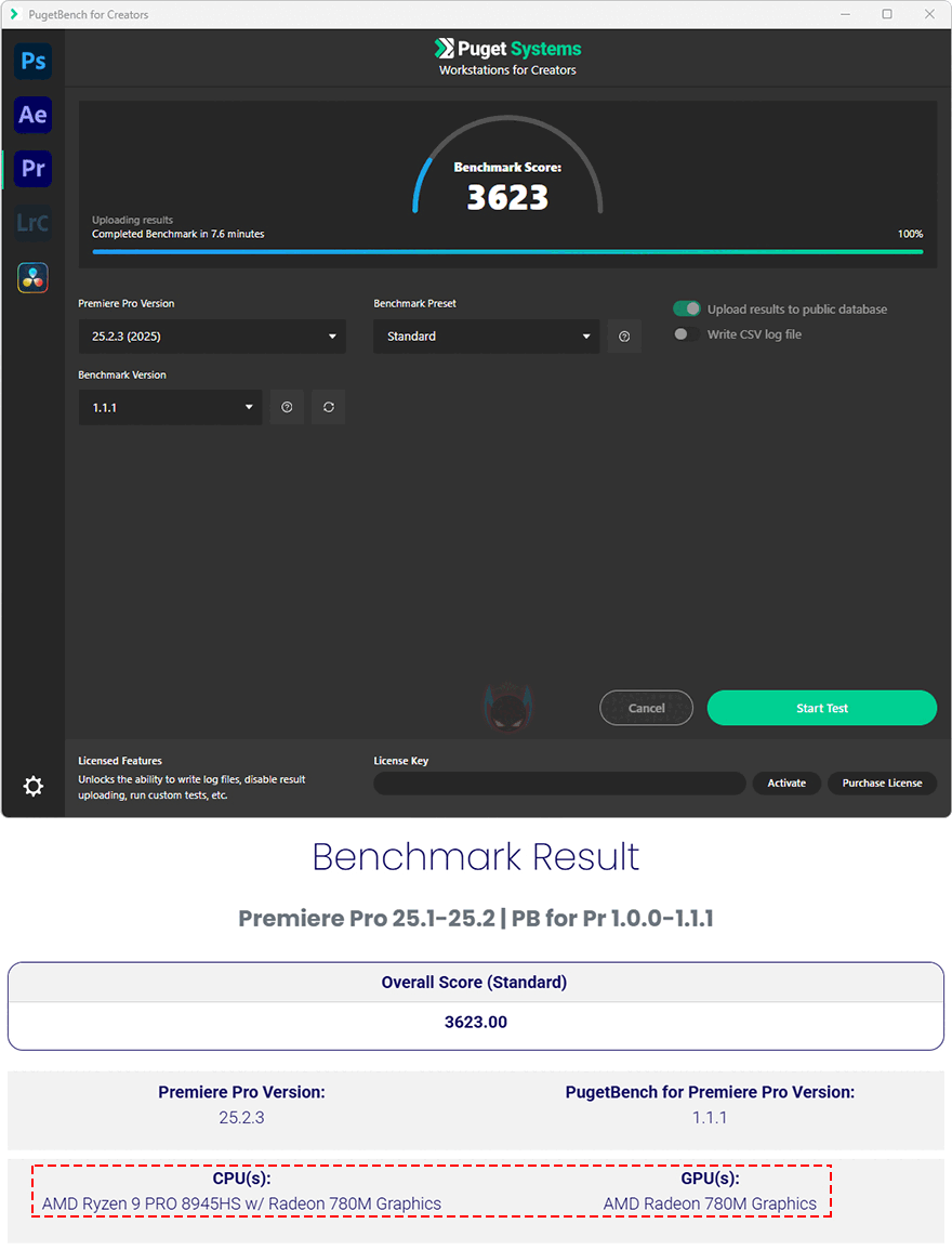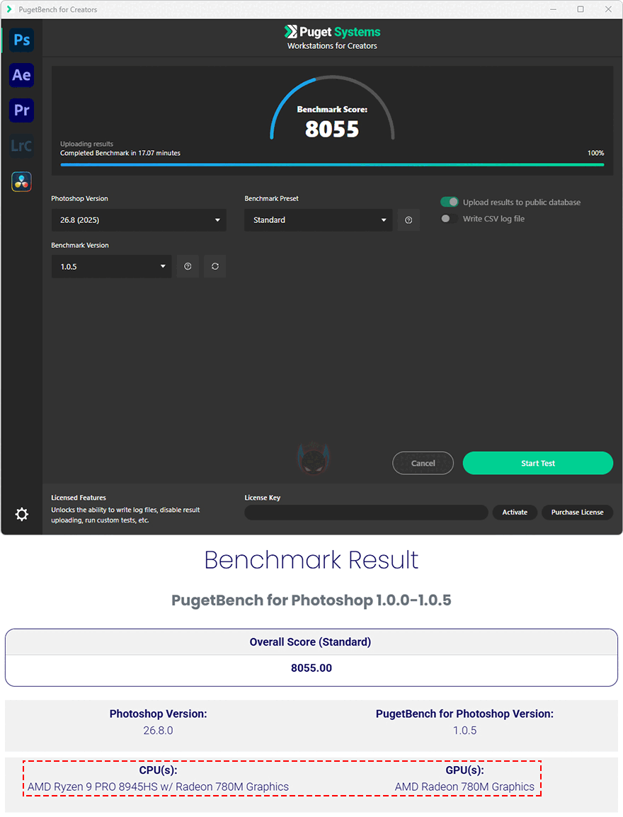 이번에는 작업 위주로 성능 비교를 해볼 텐데, 작업용이라고 하면 가장 일반적인 게 사진과 동영상 편집작업으로 이때 많이 사용하는 프로그램이 Adobe 프로그램들이죠. 그래서, 사진 편집의 포토샵(Photoshop), 동영상 편집 및 효과 작업에 애프터이펙트(After Effects), 프리미어 프로(Premiere Pro) 프로그램을 실제 작업처리로 통해 벤치마크할 수 있는 Puget System의 PugetBench for Creators를 실행해 비교해 봤습니다. 결과는 역시 라이젠 9 PRO 8945HS CPU가 탑재된 엘리트미니 UM890 PRO 미니 PC가 더 앞서는 결과를 보여줬습니다. 라이젠 8000 시리즈 모바일 프로세서에서 최상급 CPU 답게 만족스러운 결과를 보여주기 때문에 어떤 용도로 사용해도 데스크탑 부럽지 않다 볼 수 있습니다.