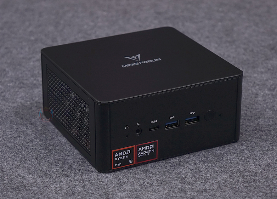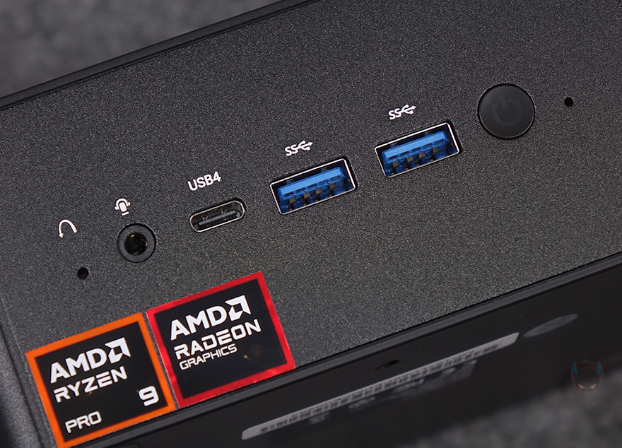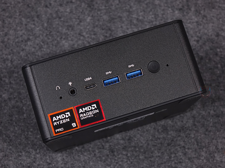본체를 좀 더 자세히 살펴보면, 전면에는 포트 및 버튼이 배치되어 있는데, 맨 오른쪽에 전원 버튼(Power button)을 시작으로 왼쪽으로 USB 3.2 Gen2 포트 2개, USB 4 Type-C 포트 1개, 3.5mm 오디오/마이크 콤보 잭, 그리고 CMOS 클리어(Clear) 버튼이 안쪽으로 배치되어 있죠. 일부 미니 PC에서는 CMOS 클리어 버튼이 없어서 문제 발생 시 난감한 경우가 발생하는데, 미니스포럼은 예전부터 이런 부분을 고려해 CMOS 클리어버튼을 필수로 적용하고 있죠. 그리고, 앞서 제품 옵션 사양에서 미리 확인했듯이, 엘리트미니 UM890 PRO 미니 PC에는 AMD 라이젠(Ryzen) 9 8945HS 또는 PRO 8945HS CPU가 탑재되었는데, 이 CPU에는 라데온 780M 내장그래픽이 내장되어 있습니다. 그래서, 본체 전면에도 이를 강조하는 CPU, 그래픽 네이밍 스티커를 부착해 놨죠. 본체 양쪽 측면에는 패턴 디자인의 에어홀 처리를 적용해 내부 발열이 신속하게 배출되도록 했습니다.