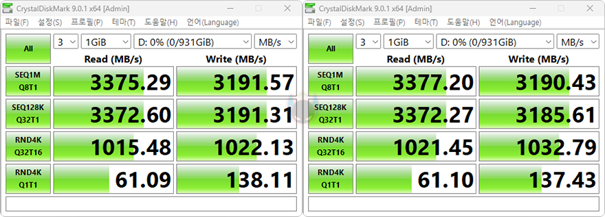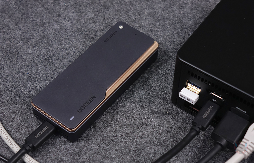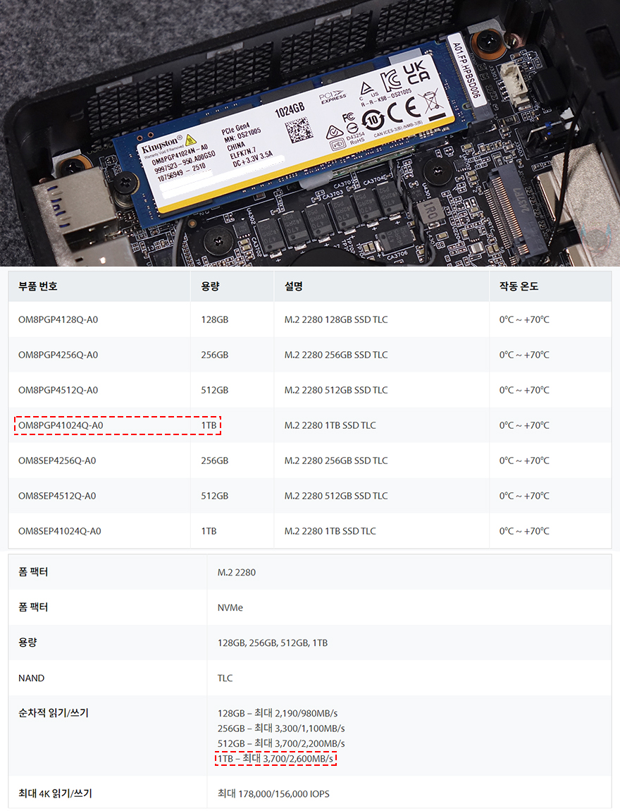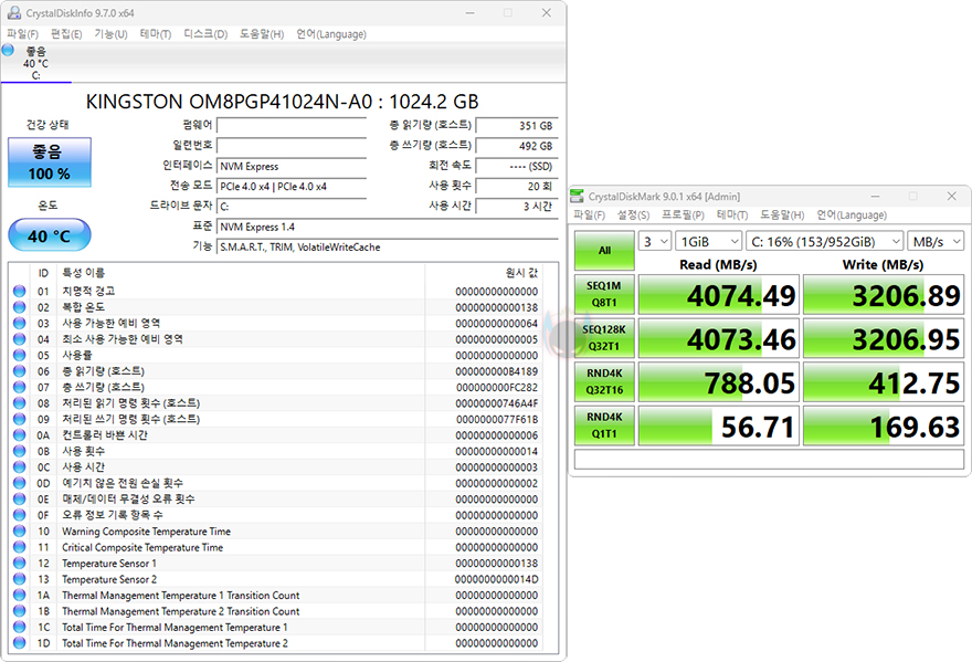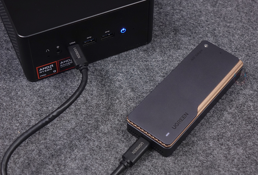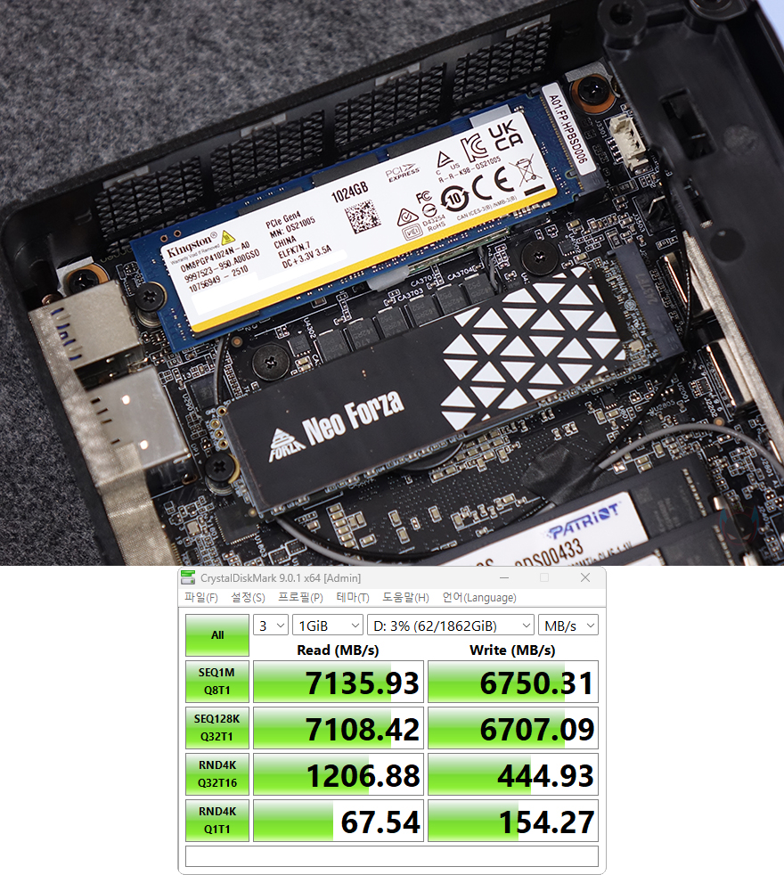 그리고, 엘리트미니 UM890 PRO 미니PC에는 앞서 내부에서 확인했듯이 2개의 M.2 SSD 슬롯을 갖추고 있습니다. 모두 PCIe 4.0x4 규격까지 지원하는데, RAM와 SSD가 기본 장착된 구매옵션을 선택하면 운영체제가 내장된 SSD가 기본 탑재되어 있습니다. 그래서, 리뷰에 사용된 모델 역시 기본 SSD 1개가 장착되어 있고, 나머지 여분의 슬롯 1개가 남아서, 기본 제공되는 SSD의 성능과 추가로 SSD를 장착해 CrystalDiskMark를 통해 읽기와 쓰기 성능을 확인해 봤습니다. 먼저, 기본 장착된 SSD 즉 운영체제가 담긴 SSD는 Kingston사 1TB 용량 제품으로 해당 모델의 스펙상 속도보다 좀 더 빠른 속도의 결과값을 보여줬습니다. 물론, PCIe 4.0x4 규격상의 최대 속도수치는 아닙니다. 그래서, 나머지 여분의 슬롯에는 PCIe 4.0x4 규격의 NVMe SSD를 장착해 속도측정을 해봤습니다. 확인결과, 최대 읽기 7000MB/s 대와 최대 쓰기 6500MB/s 대 이상인 것을 확인할 수 있었습니다. 그리고, 엘리트미니 UM890 PRO 미니 PC에는 전후면에 각각 USB 4 Type-C 포트를 갖추고 있죠. 그래서, 이 역시 USB 4.0 지원의 외장 SSD를 장착해 속도 측정을 해봤습니다. 확인결과, USB 4.0 외장 SSD를 사용했을 시 나오는 최대 읽기/쓰기의 3000MB/s 대 속도를 확인할 수 있었습니다.